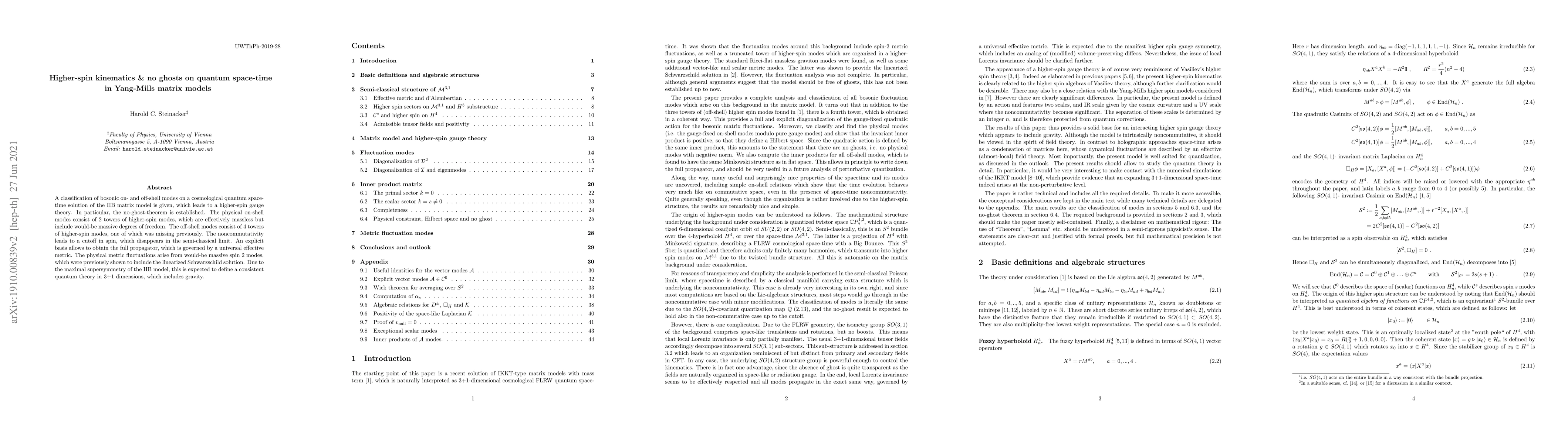 A classification of bosonic on- and off-shell modes on a cosmological quantum space-time solution of the IIB matrix model is given, which leads to a higher-spin gauge theory. In particular, the no-ghost-theorem is established. The physical on-shell modes consist of 2 towers of higher-spin modes, which are effectively massless but include would-be massive degrees of freedom. The off-shell modes consist of 4 towers of higher-spin modes, one of which was missing previously. The noncommutativity leads to a cutoff in spin, which disappears in the semi-classical limit. An explicit basis allows to obtain the full propagator, which is governed by a universal effective metric. The physical metric fluctuations arise from would-be massive spin 2 modes, which were previously shown to include the linearized Schwarzschild solution. Due to the relation with ${\cal N}=4$ super-Yang-Mills, this is expected to define a consistent quantum theory in 3+1 dimensions, which includes gravity.