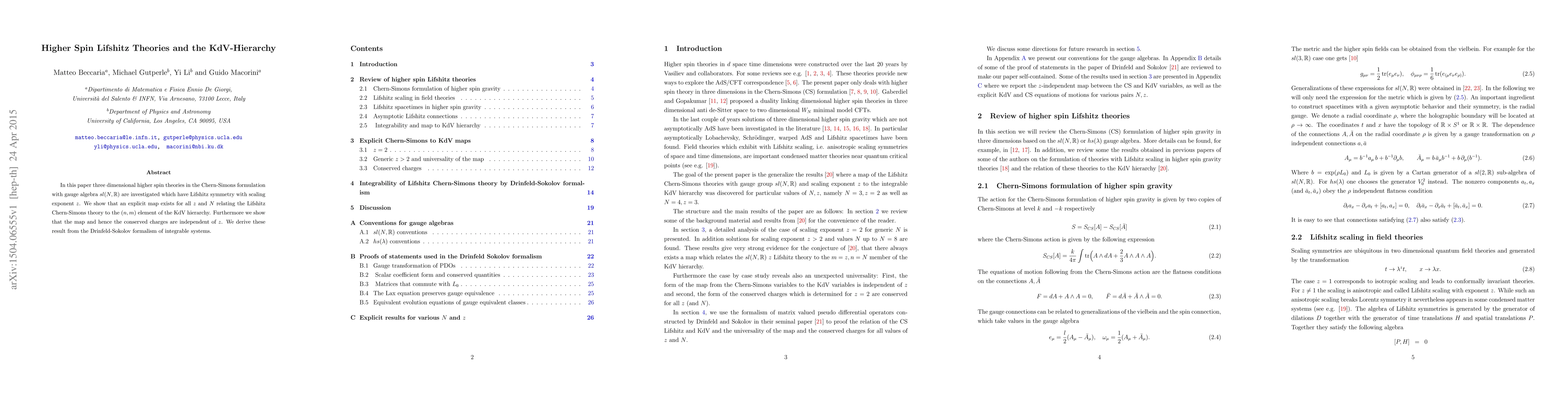 In this paper three dimensional higher spin theories in the Chern-Simons formulation with gauge algebra $sl(N,R)$ are investigated which have Lifshitz symmetry with scaling exponent $z$. We show that an explicit map exists for all $z$ and $N$ relating the Lifshitz Chern-Simons theory to the $(n,m)$ element of the KdV hierarchy. Furthermore we show that the map and hence the conserved charges are independent of $z$. We derive these result from the Drinfeld-Sokolov formalism of integrable systems.