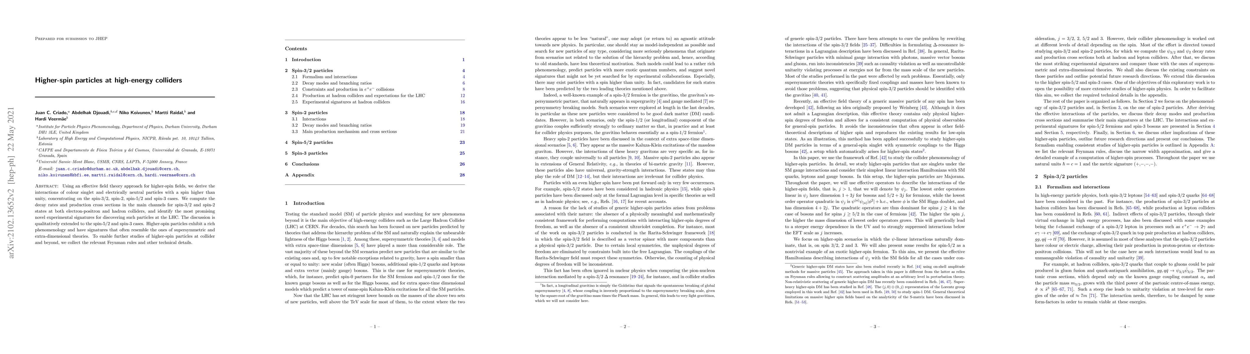 This paper employs an effective field theory to explore the interactions and phenomenology of higher-spin particles (spin-3/2, spin-2, spin-5/2, and spin-3) in high-energy colliders, calculating decay rates and production cross sections for spin-3/2 and spin-2 states, and identifying potential experimental signatures for their discovery at the LHC.