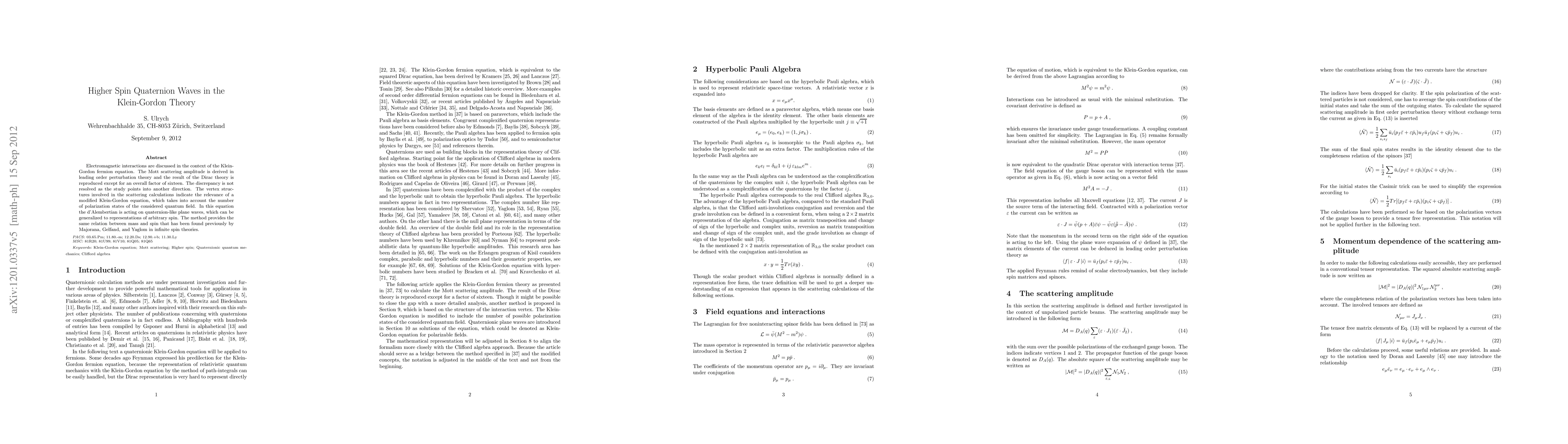 Electromagnetic interactions are discussed in the context of the Klein-Gordon fermion equation. The Mott scattering amplitude is derived in leading order perturbation theory and the result of the Dirac theory is reproduced except for an overall factor of sixteen. The discrepancy is not resolved as the study points into another direction. The vertex structures involved in the scattering calculations indicate the relevance of a modified Klein-Gordon equation, which takes into account the number of polarization states of the considered quantum field. In this equation the d'Alembertian is acting on quaternion-like plane waves, which can be generalized to representations of arbitrary spin. The method provides the same relation between mass and spin that has been found previously by Majorana, Gelfand, and Yaglom in infinite spin theories.