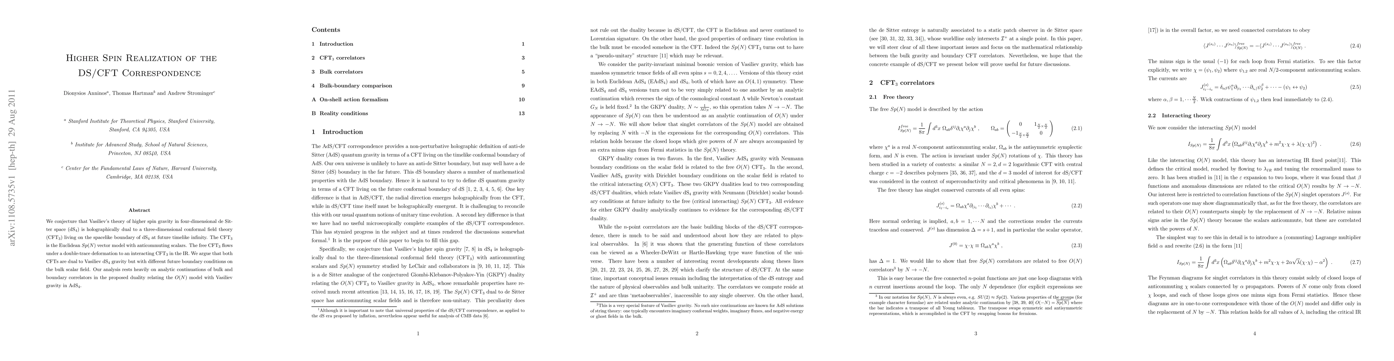 The paper proposes a holographic duality between Vasiliev's higher spin gravity in 4D de Sitter space (dS) and a 3D Euclidean Sp(N) CFT on its future boundary, with the CFT undergoing a transition from free to interacting via a double-trace deformation. The analysis relies on correlator continuations linking the O(N) model to Vasiliev gravity in AdS.