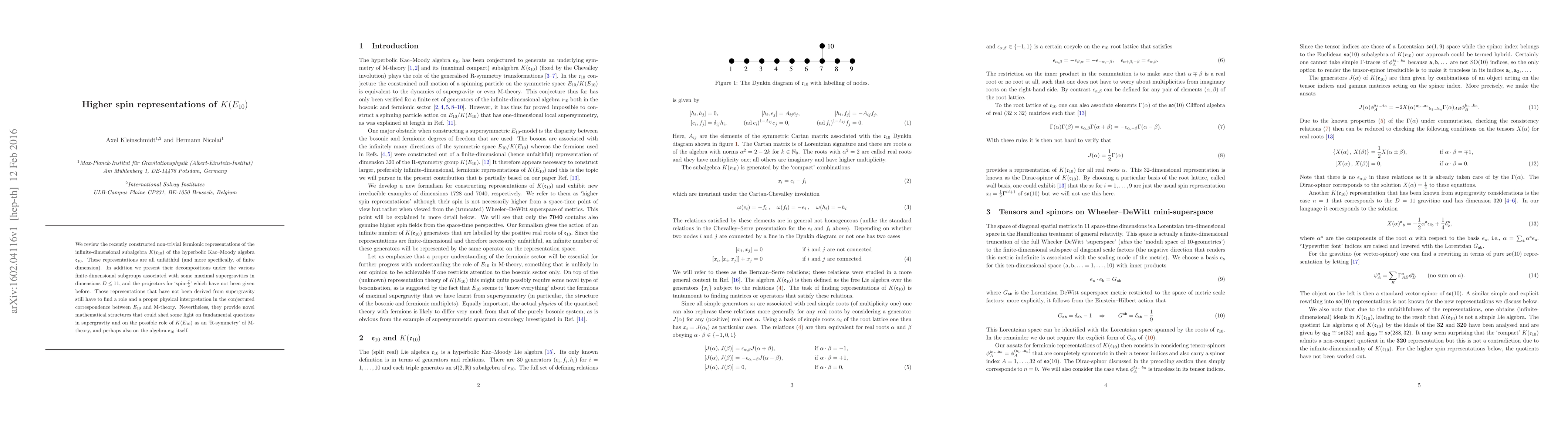 We review the recently constructed non-trivial fermionic representations of the infinite-dimensional subalgebra K(E10) of the hyperbolic Kac--Moody algebra E10. These representations are all unfaithful (and more specifically, of finite dimension). In addition we present their decompositions under the various finite-dimensional subgroups associated with some maximal supergravities in dimensions D<=11, and the projectors for `spin-7/2' which have not been given before. Those representations that have not been derived from supergravity still have to find a role and a proper physical interpretation in the conjectured correspondence between E10 and M-theory. Nevertheless, they provide novel mathematical structures that could shed some light on fundamental questions in supergravity and on the possible role of K(E10) as an `R-symmetry' of M-theory, and perhaps also on the algebra E10 itself.