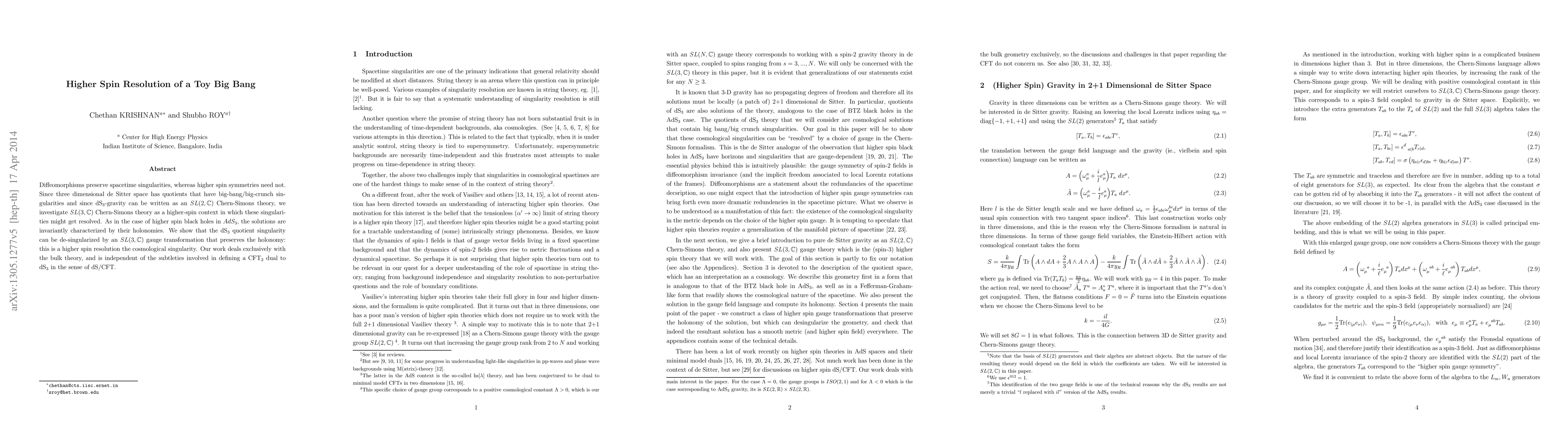 This research proposes a resolution for cosmological singularities in de Sitter 3-space (dS_3) using higher spin symmetries, specifically SL(3,C) Chern-Simons theory. It demonstrates that these singularities can be de-singularized by gauge transformations preserving holonomy, offering a higher spin resolution for the big-bang singularity.