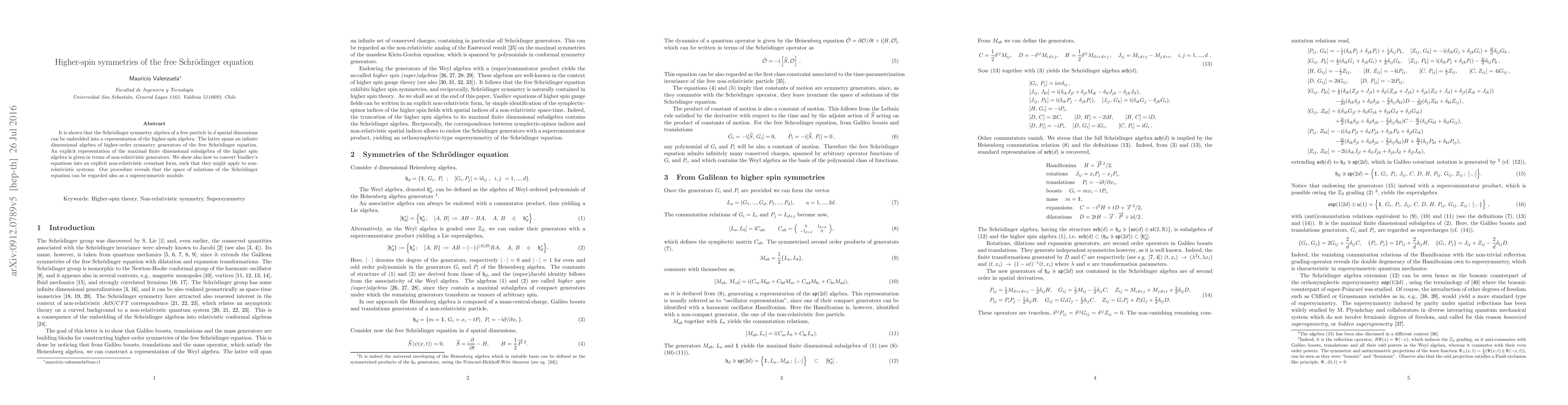 This paper demonstrates that the Schrödinger symmetry algebra can be embedded into a higher-spin algebra, revealing an infinite-dimensional algebra of higher-order symmetry generators. It also provides a non-relativistic covariant form of Vasiliev's equations applicable to non-relativistic systems, showing the Schrödinger equation's solution space as a supersymmetric module.