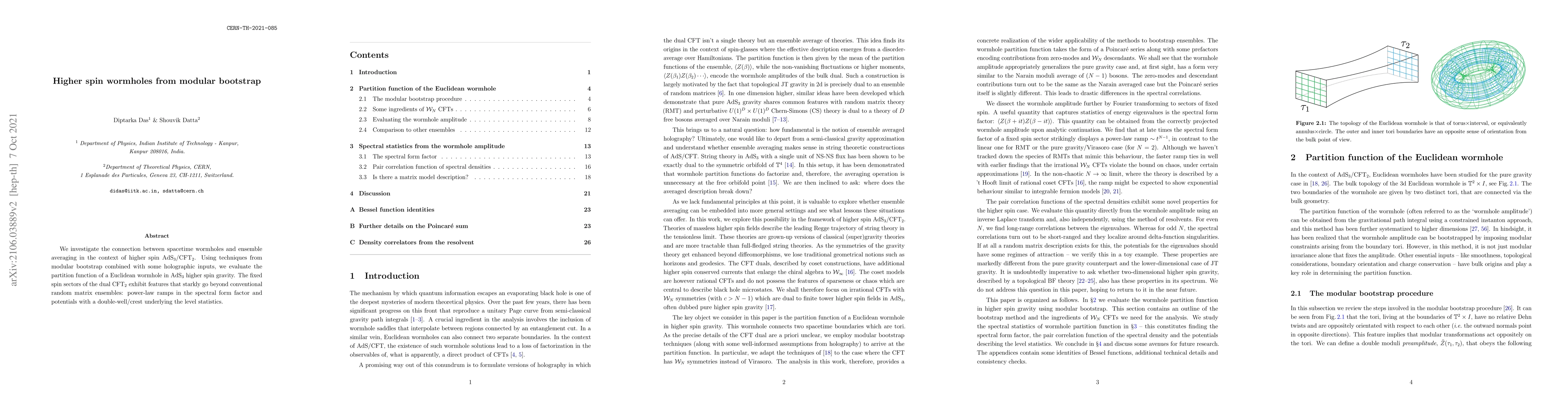 This paper explores the relationship between higher spin AdS$_3$/CFT$_2$ and spacetime wormholes, employing modular bootstrap techniques to evaluate the partition function of Euclidean wormholes. The study reveals unique features in the dual CFT$_2$ beyond typical random matrix ensembles, including power-law ramps and double-well potentials in spectral form factors.