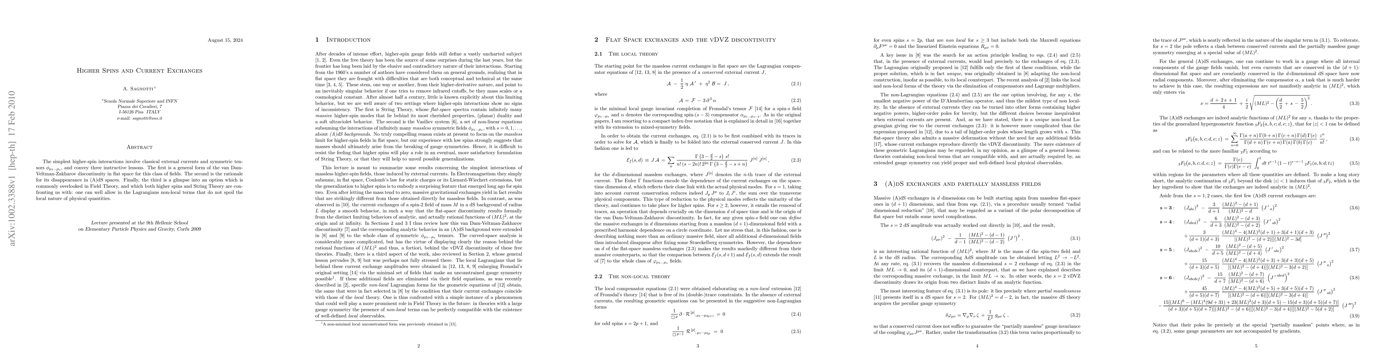 The simplest higher-spin interactions involve classical external currents and symmetric tensors $\phi_{\m_1 ... \m_s}$, and convey three instructive lessons. The first is a general form of the van Dam-Veltman-Zakharov discontinuity in flat space for this class of fields. The second is the rationale for its disappearance in (A)dS spaces. Finally, the third is a glimpse into an option which is commonly overlooked in Field Theory, and which both higher spins and String Theory are confronting us with: one can well allow in the Lagrangians non-local terms that do not spoil the local nature of physical quantities.