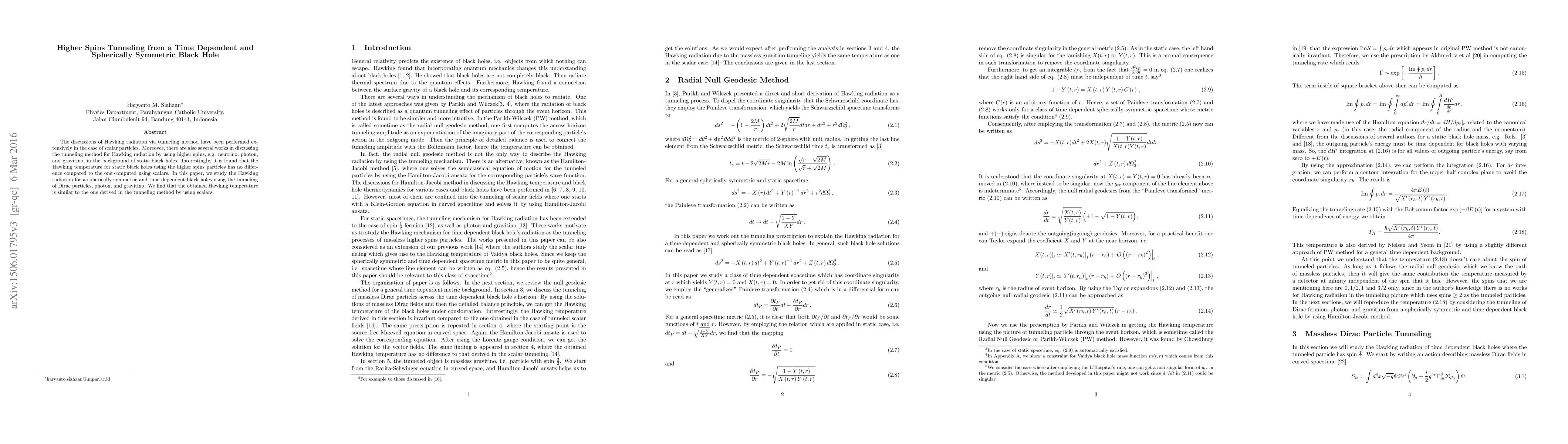 This paper investigates Hawking radiation via the tunneling method for Dirac particles, photons, and gravitinos in the context of spherically symmetric and time-dependent black holes. The study finds that the Hawking temperature derived from higher spin particles is comparable to that obtained using scalar particles.
