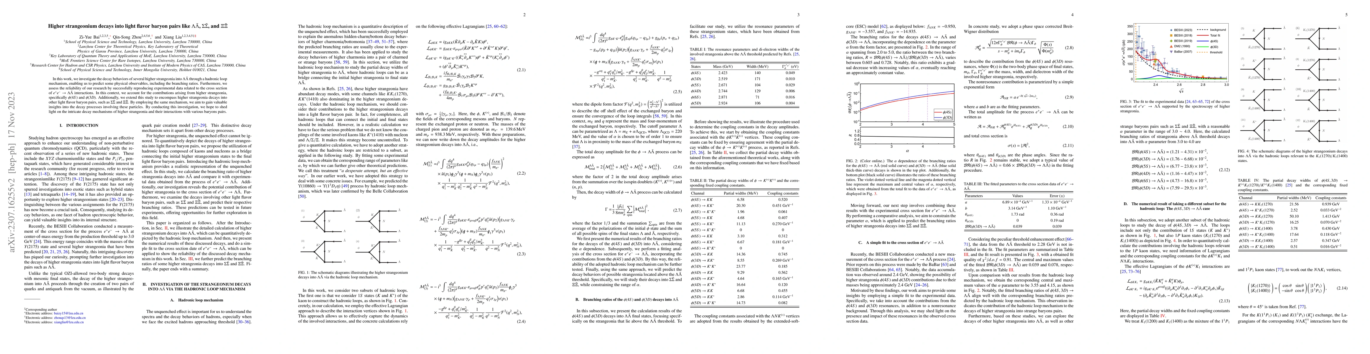 In this work, we investigate the decay behaviors of several higher strangeonia into $\Lambda\bar\Lambda$ through a hadronic loop mechanism, enabling us to predict some physical observables, including the branching ratios. Furthermore, we assess the reliability of our research by successfully reproducing experimental data related to the cross section of $e^+e^-\to\Lambda\bar{\Lambda}$ interactions. In this context, we account for the contributions arising from higher strangeonia, specifically $\phi(4S)$ and $\phi(3D)$. Additionally, we extend this study to encompass higher strangeonia decays into other light flavor baryon pairs, such as $\Sigma\bar\Sigma$ and $\Xi\bar\Xi$. By employing the same mechanism, we aim to gain valuable insights into the decay processes involving these particles. By conducting this investigation, we hope to shed light on the intricate decay mechanisms of higher strangeonia and their interactions with various baryons pairs.