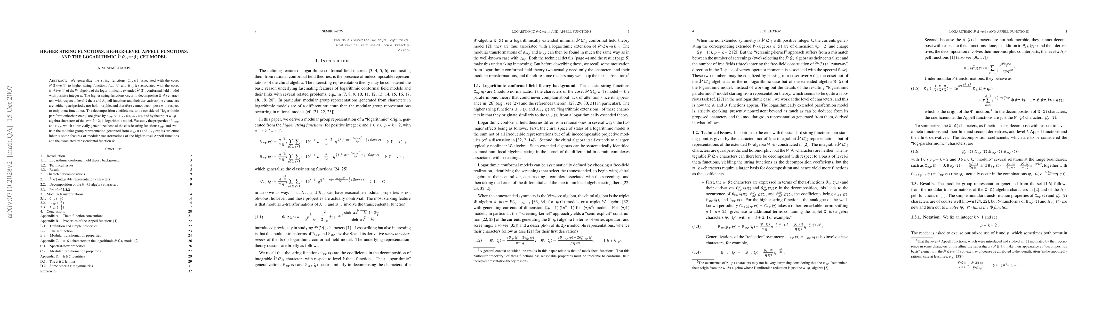 We generalize the string functions C_{n,r}(tau) associated with the coset ^sl(2)_k/u(1) to higher string functions A_{n,r}(tau) and B_{n,r}(tau) associated with the coset W(k)/u(1) of the W-algebra of the logarithmically extended ^sl(2)_k conformal field model with positive integer k. The higher string functions occur in decomposing W(k) characters with respect to level-k theta and Appell functions and their derivatives (the characters are neither quasiperiodic nor holomorphic, and therefore cannot decompose with respect to only theta-functions). The decomposition coefficients, to be considered ``logarithmic parafermionic characters,'' are given by A_{n,r}(tau), B_{n,r}(tau), C_{n,r}(tau), and by the triplet \mathscr{W}(p)-algebra characters of the (p=k+2,1) logarithmic model. We study the properties of A_{n,r} and B_{n,r}, which nontrivially generalize those of the classic string functions C_{n,r}, and evaluate the modular group representation generated from A_{n,r}(tau) and B_{n,r}(tau); its structure inherits some features of modular transformations of the higher-level Appell functions and the associated transcendental function Phi.