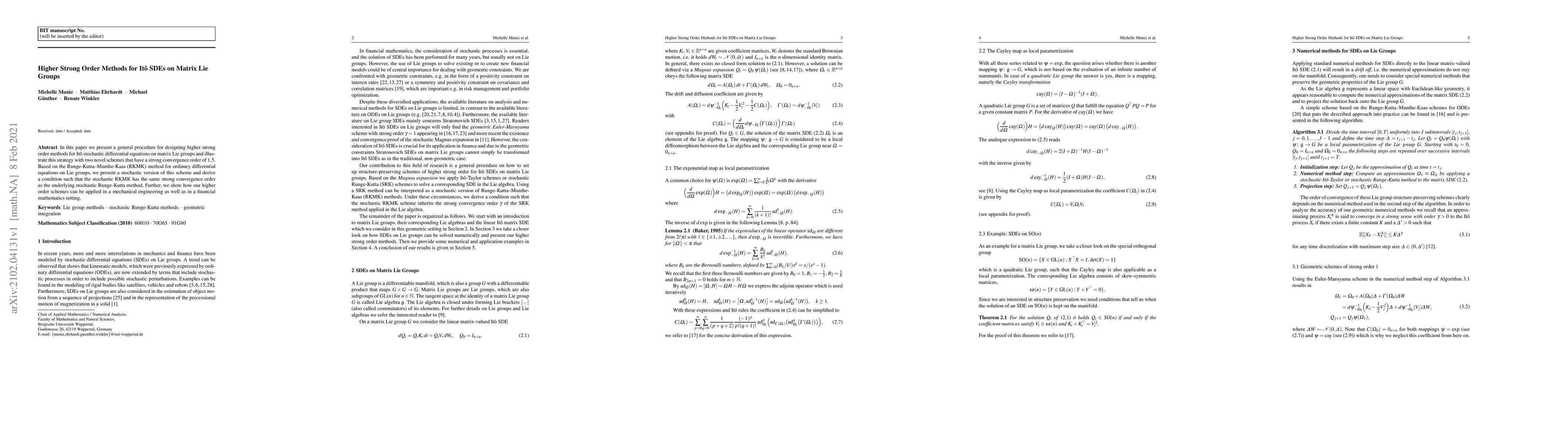 This paper introduces a method for creating higher-order strong order methods for stochastic differential equations on matrix Lie groups, with applications in mechanical engineering and financial mathematics.