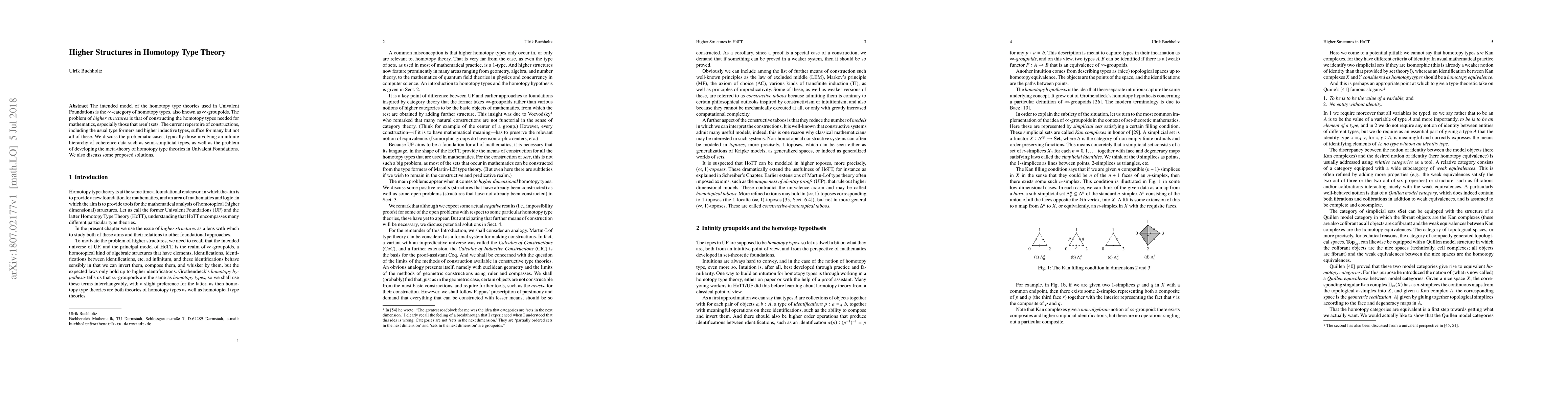 The intended model of the homotopy type theories used in Univalent Foundations is the infinity-category of homotopy types, also known as infinity-groupoids. The problem of higher structures is that of constructing the homotopy types needed for mathematics, especially those that aren't sets. The current repertoire of constructions, including the usual type formers and higher inductive types, suffice for many but not all of these. We discuss the problematic cases, typically those involving an infinite hierarchy of coherence data such as semi-simplicial types, as well as the problem of developing the meta-theory of homotopy type theories in Univalent Foundations. We also discuss some proposed solutions.