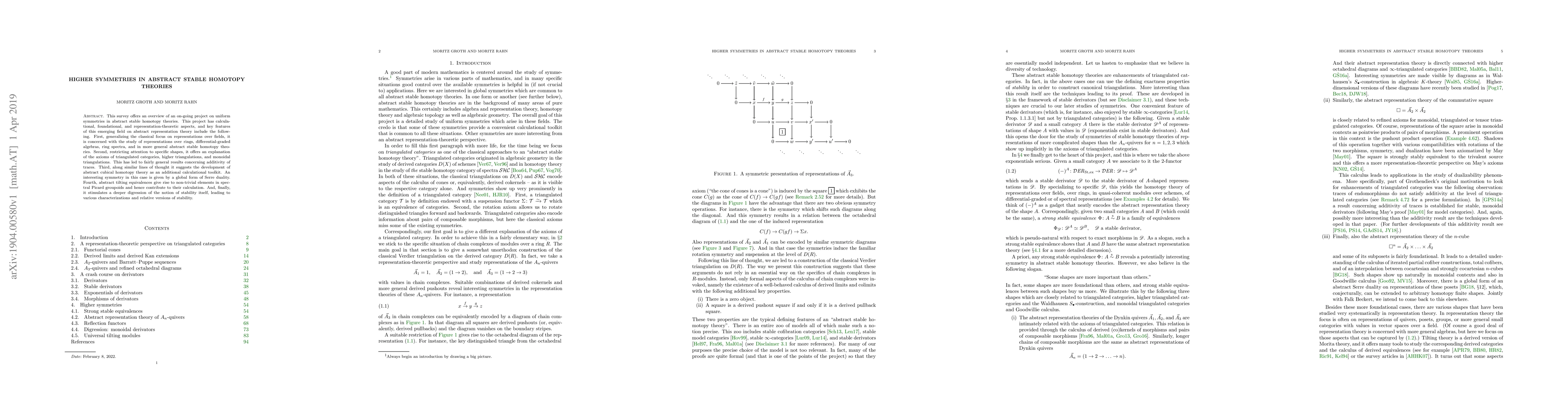 This survey offers an overview of an on-going project on uniform symmetries in abstract stable homotopy theories. This project has calculational, foundational, and representation-theoretic aspects, and key features of this emerging field on abstract representation theory include the following. First, generalizing the classical focus on representations over fields, it is concerned with the study of representations over rings, differential-graded algebras, ring spectra, and in more general abstract stable homotopy theories. Second, restricting attention to specific shapes, it offers an explanation of the axioms of triangulated categories, higher triangulations, and monoidal triangulations. This has led to fairly general results concerning additivity of traces. Third, along similar lines of thought it suggests the development of abstract cubical homotopy theory as an additional calculational toolkit. An interesting symmetry in this case is given by a global form of Serre duality. Fourth, abstract tilting equivalences give rise to non-trivial elements in spectral Picard groupoids and hence contribute to their calculation. And, finally, it stimulates a deeper digression of the notion of stability itself, leading to various characterizations and relative versions of stability.