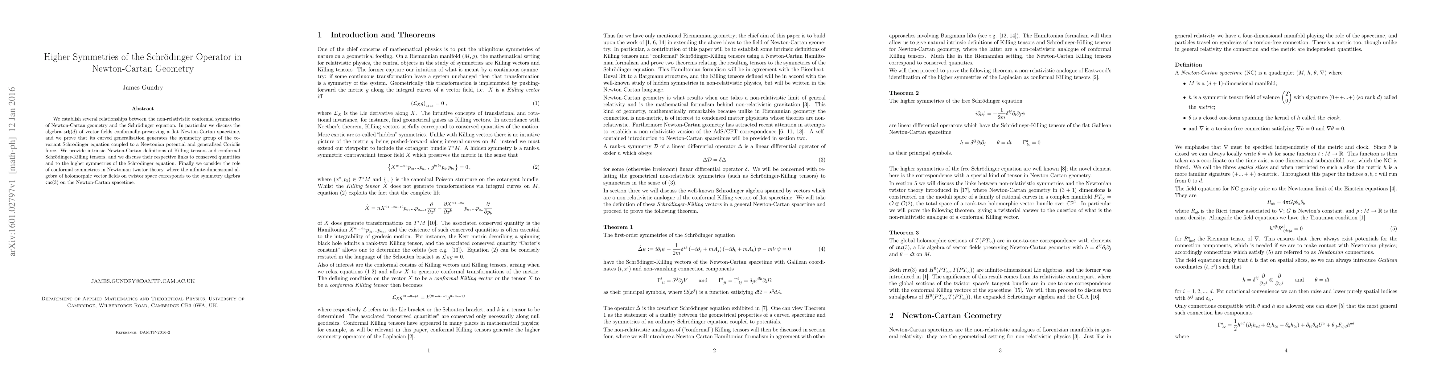 This paper explores the symmetries of the Schrödinger operator within Newton-Cartan geometry, establishing connections between conformal symmetries and the Schrödinger equation, and identifying Killing tensors and their conserved quantities in this framework. It also links conformal symmetries to the symmetry algebra in Newtonian twistor theory.