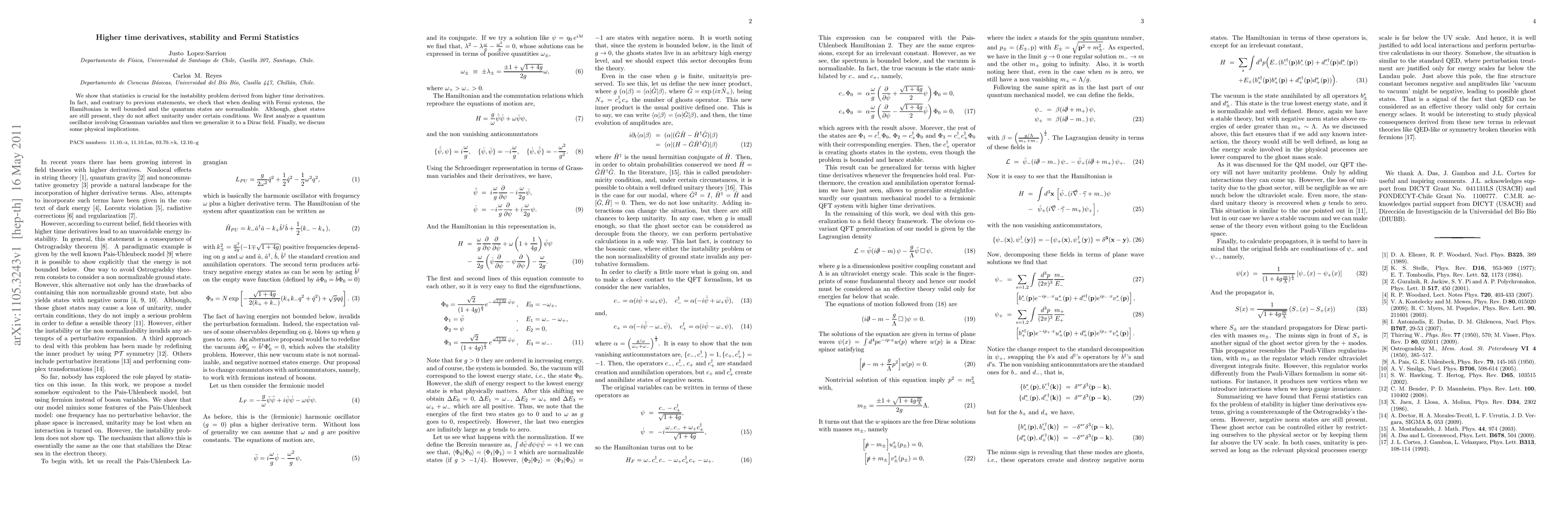 We show that statistics is crucial for the instability problem derived from higher time derivatives. In fact, and contrary to previous statements, we check that when dealing with Fermi systems, the Hamiltonian is well bounded and the quantum states are normalizable. Although, ghost states are still present, they do not affect unitarity under certain conditions. We first analyze a quantum oscillator involving Grassman variables and then we generalize it to a Dirac field. Finally, we discuss some physical implications