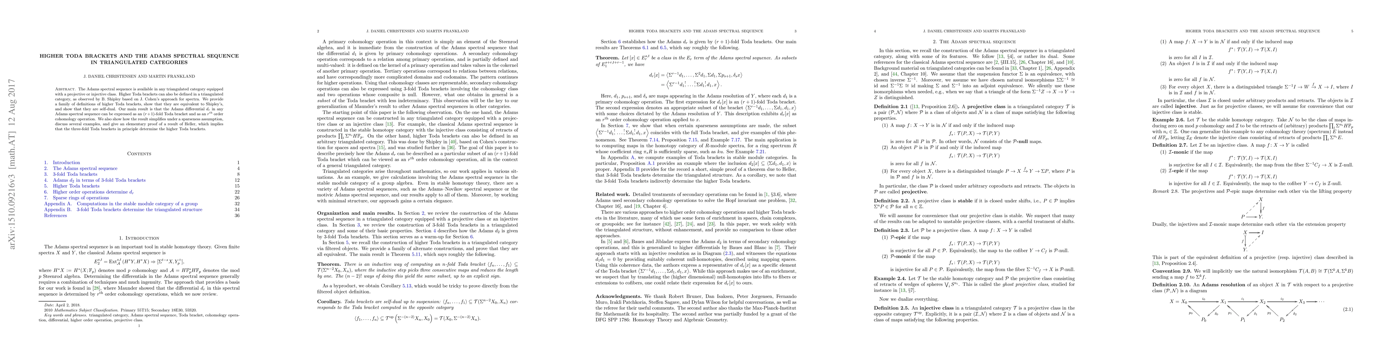 This paper explores the Adams spectral sequence in triangulated categories, defining higher Toda brackets and proving their equivalence to B. Shipley's approach. The main result shows that the Adams differential can be expressed as an $(r+1)$-fold Toda bracket and an $r^{\text{th}}$ order cohomology operation, with simplifications under sparseness assumptions.