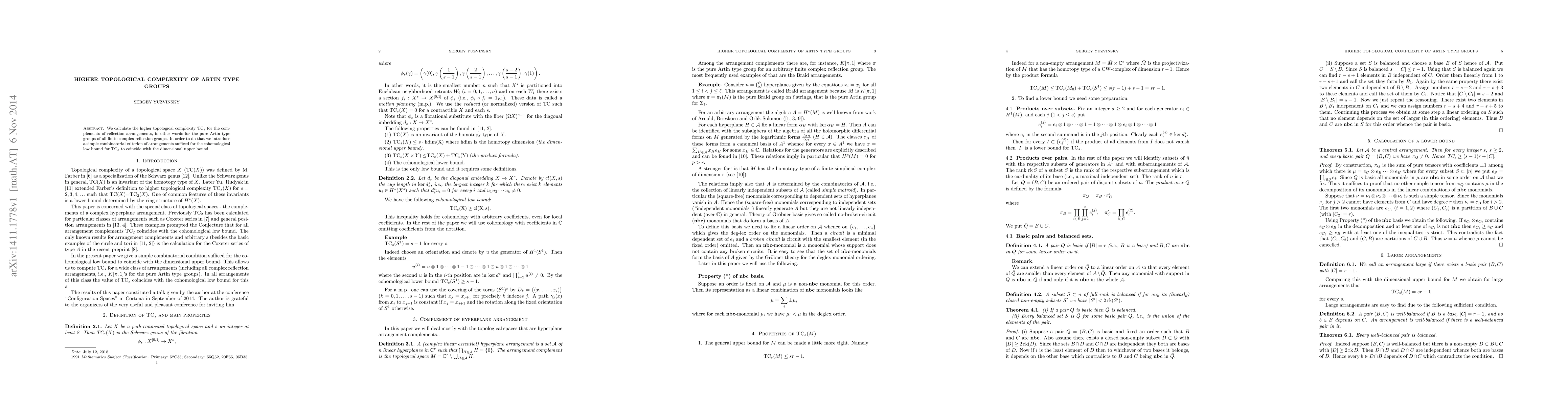 We calculate the higher topological complexity TC$_s$ for the complements of reflection arrangements, in other words for the pure Artin type groups of all finite complex reflection groups. In order to do that we introduce a simple combinatorial criterion of arrangements sufficed for the cohomological low bound for TC$_s$ to coincide with the dimensional upper bound.