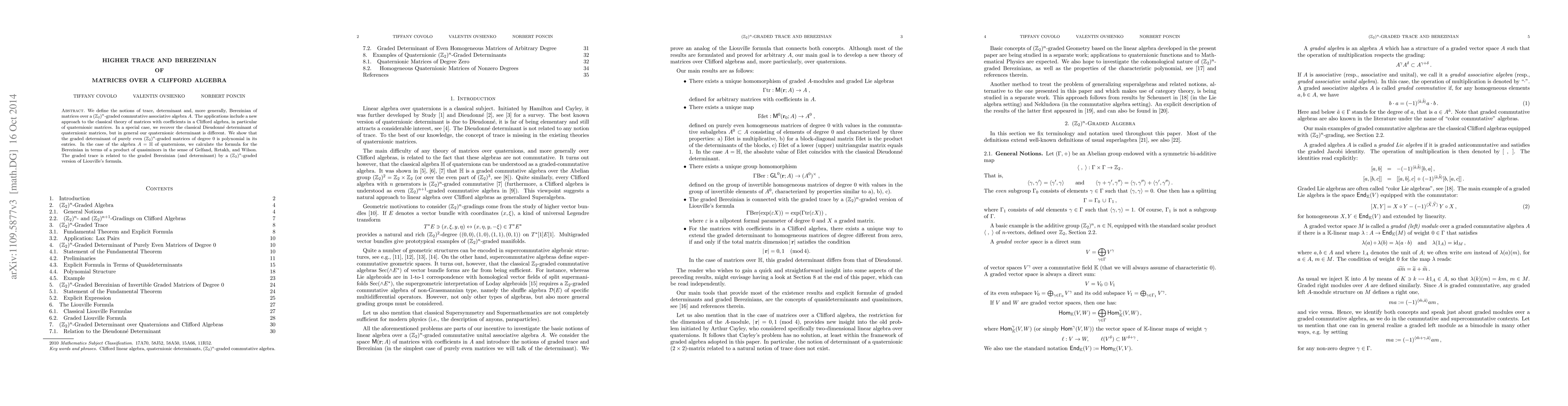 This paper introduces the concepts of trace, determinant, and Berezinian for matrices over a (Z_2)^n graded commutative algebra, with applications to matrices in Clifford algebras, particularly quaternionic matrices. It provides a new perspective on the classical theory and computes the Berezinian for the algebra of quaternions using quasiminors.