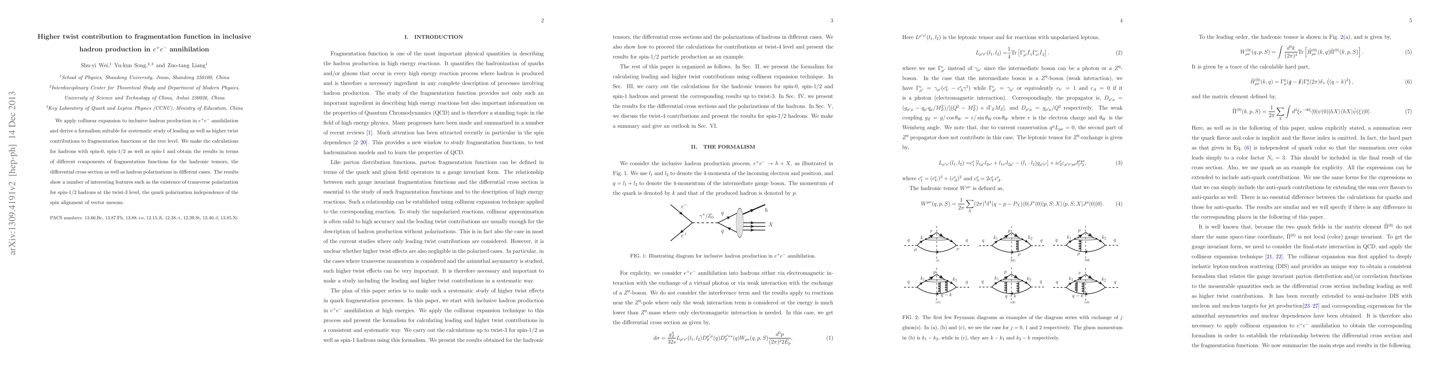 We apply collinear expansion to inclusive hadron production in $e^+e^-$ annihilation and derive a formalism suitable for systematic study of leading as well as higher twist contributions to fragmentation functions at the tree level. We make the calculations for hadrons with spin-0, spin-1/2 as well as spin-1 and obtain the results in terms of different components of fragmentation functions for the hadronic tensors, the differential cross section as well as hadron polarizations in different cases. The results show a number of interesting features such as the existence of transverse polarization for spin-1/2 hadrons at the twist-3 level, the quark polarization independence of the spin alignment of vector mesons.
