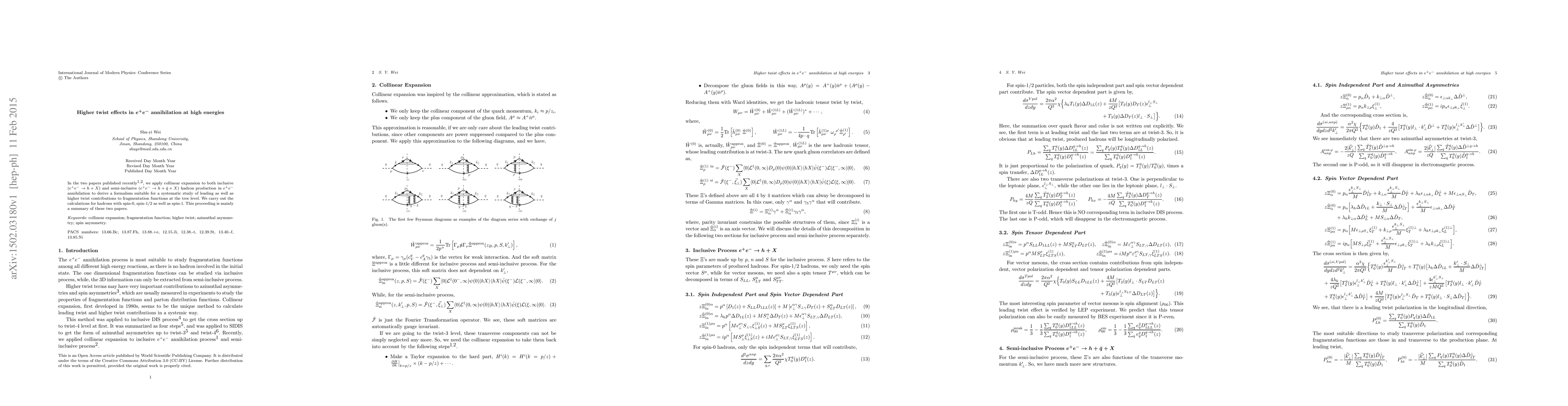 In the two papers published recently, we apply collinear expansion to both inclusive ($e^+ e^- \to h+X$) and semi-inclusive ($e^+ e^- \to h + \bar q + X$) hadron production in $e^+ e^-$ annihilation to derive a formalism suitable for a systematic study of leading as well as higher twist contributions to fragmentation functions at the tree level. We carry out the calculations for hadrons with spin-0, spin-1/2 as well as spin-1. This proceeding is mainly a summary of these two papers.