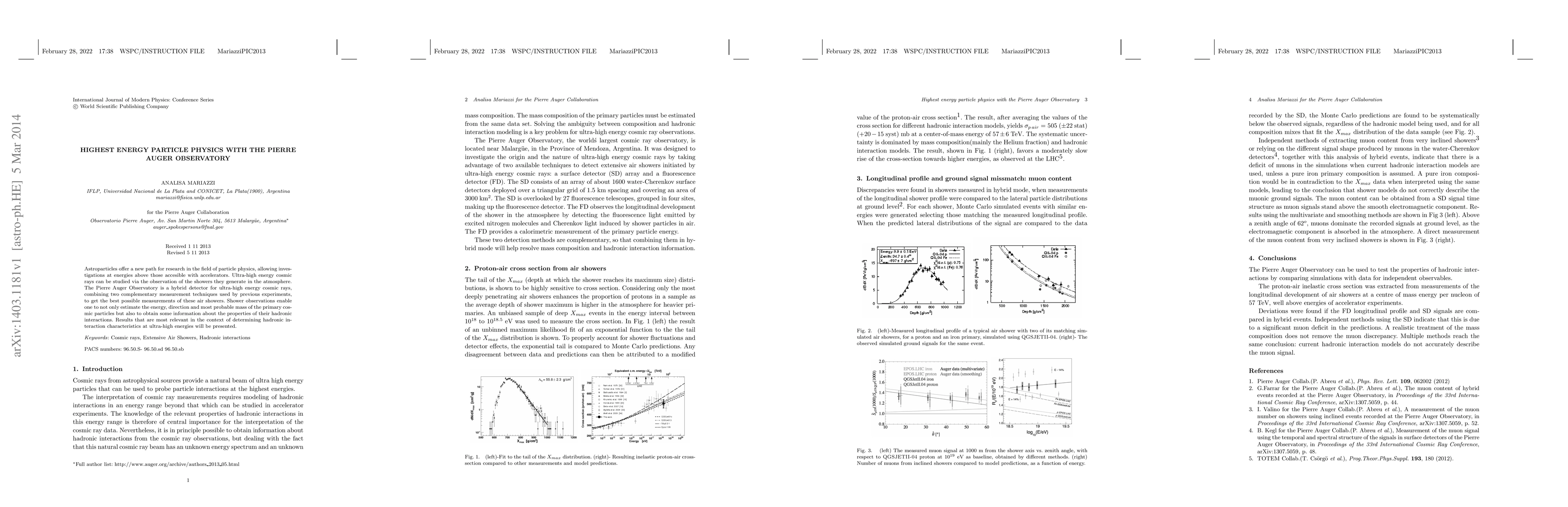The Pierre Auger Observatory employs a hybrid detection method to study ultra-high energy cosmic rays, providing precise measurements of their energy, direction, and probable mass. The research highlights the observatory's contributions to understanding the properties of hadronic interactions at these extreme energies.