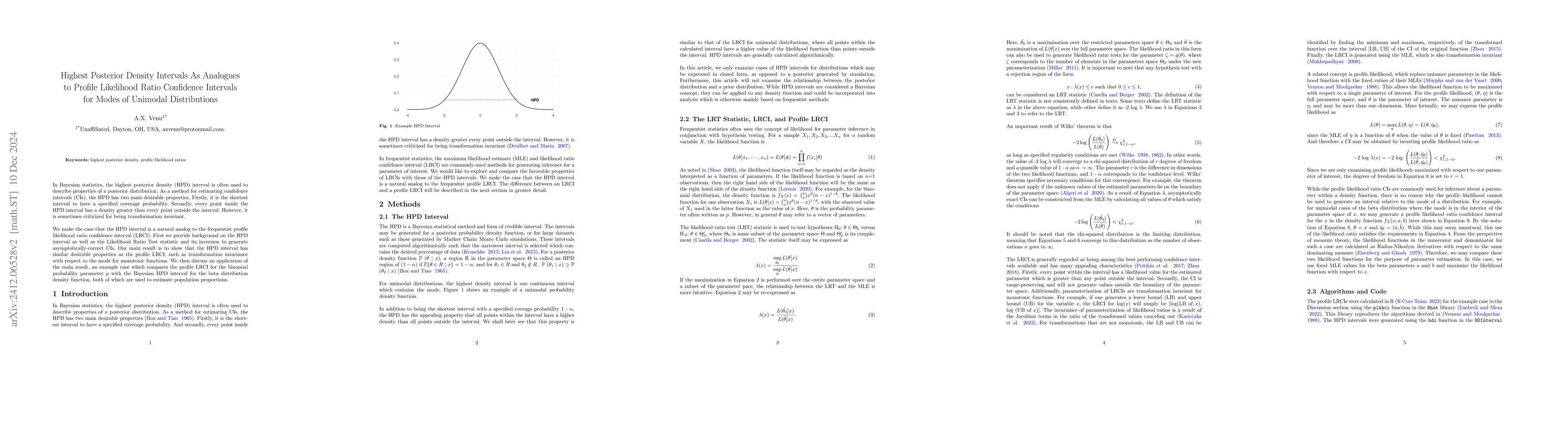 This paper argues that highest posterior density (HPD) intervals in Bayesian statistics are analogous to profile likelihood ratio confidence intervals (LRCI). The authors demonstrate that HPD intervals share desirable properties with profile LRCI, including transformation invariance for monotonic functions, and illustrate this through an example comparing binomial and beta distribution applications.