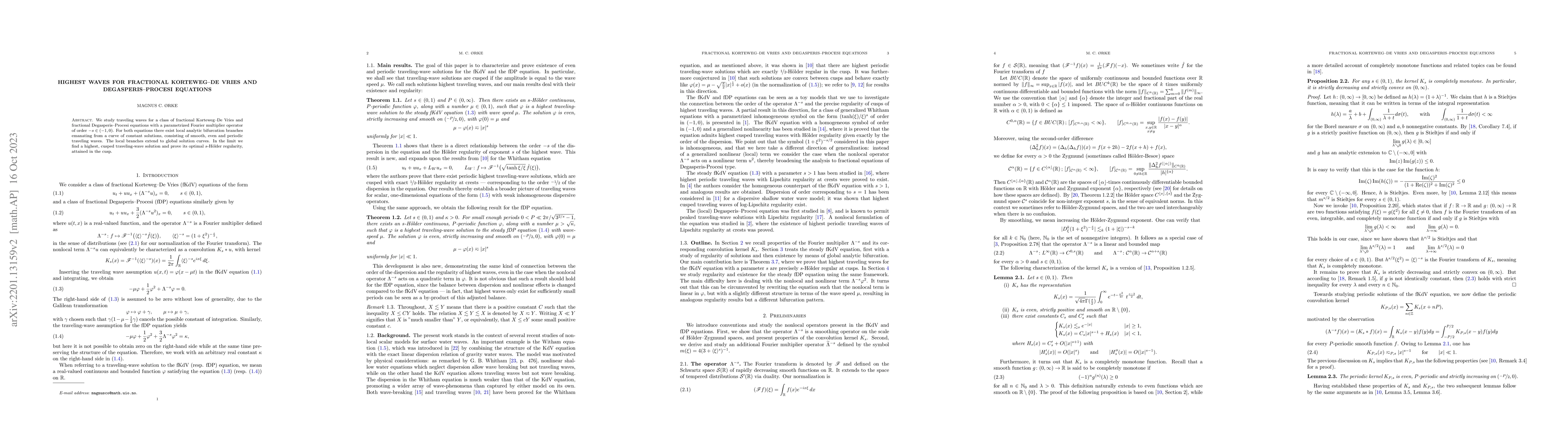 This paper investigates traveling waves for fractional versions of the Korteweg-De Vries and Degasperis-Procesi equations, revealing local analytic bifurcations from constant solutions leading to smooth, periodic waves. It identifies a highest cusped traveling wave solution and proves its optimal $s$-Hölder regularity at the cusp.