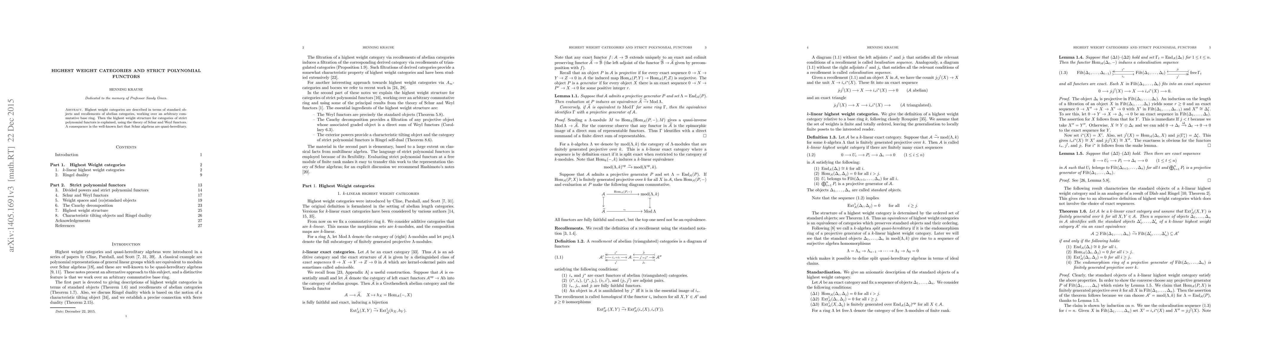 This paper explores highest weight categories via standard objects and abelian category recollements over a general commutative base ring, then applies this framework to strict polynomial functors, demonstrating the quasi-hereditary nature of Schur algebras.