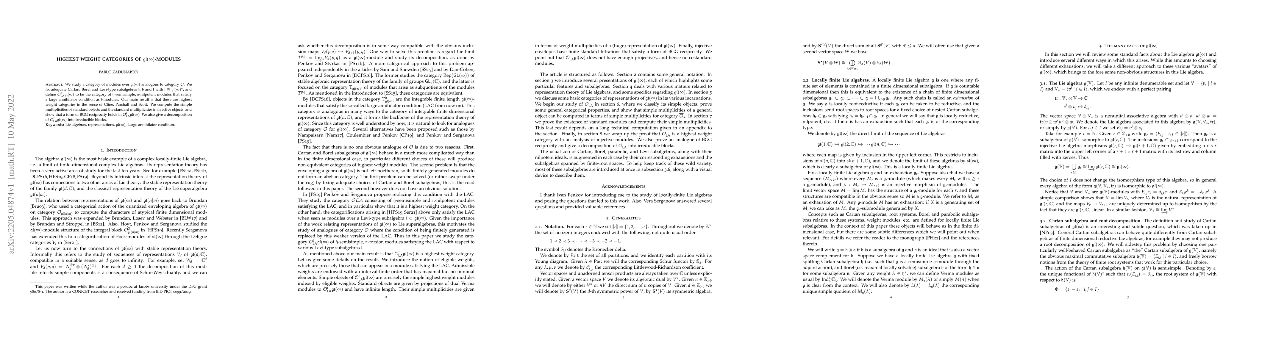 We study a category of modules over $\mathfrak{gl}(\infty)$ analogous to category $\mathcal O$. We fix adequate Cartan, Borel and Levi-type subalgebras $\mathfrak h, \mathfrak b$ and $\mathfrak l$ with $\mathfrak l \cong \mathfrak{gl}(\infty)^n$, and define $\mathcal O_{\mathsf{LA}}^{\mathfrak l}{\mathfrak{gl}(\infty)}$ to be the category of $\mathfrak h$-semisimple, $\mathfrak n$-nilpotent modules that satisfy a large annihilator condition as $\mathfrak l$-modules. Our main result is that these are highest weight categories in the sense of Cline, Parshall and Scott. We compute the simple multiplicities of standard objects and the standard multiplicities in injective objects, and show that a form of BGG reciprocity holds in $\mathcal O_{\mathsf{LA}}^{\mathfrak l}{\mathfrak{gl}(\infty)}$. We also give a decomposition of $\mathcal O_{\mathsf{LA}}^{\mathfrak l}{\mathfrak{gl}(\infty)}$ into irreducible blocks.