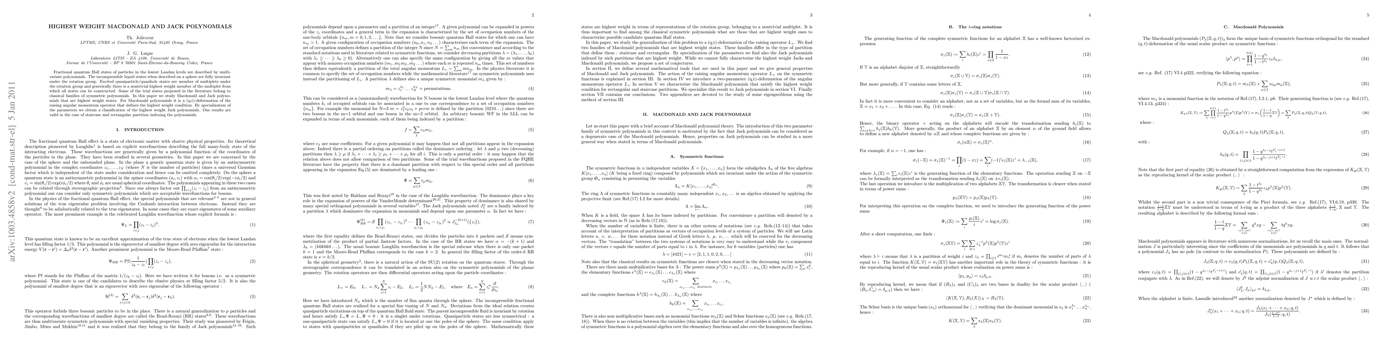 This paper investigates the highest weight states of fractional quantum Hall states using Macdonald and Jack polynomials, revealing a (q,t)-deformation of the raising angular momentum operator for Macdonald polynomials. It also classifies highest weight Jack polynomials by specializing parameters, applicable to staircase and rectangular partition indexing.