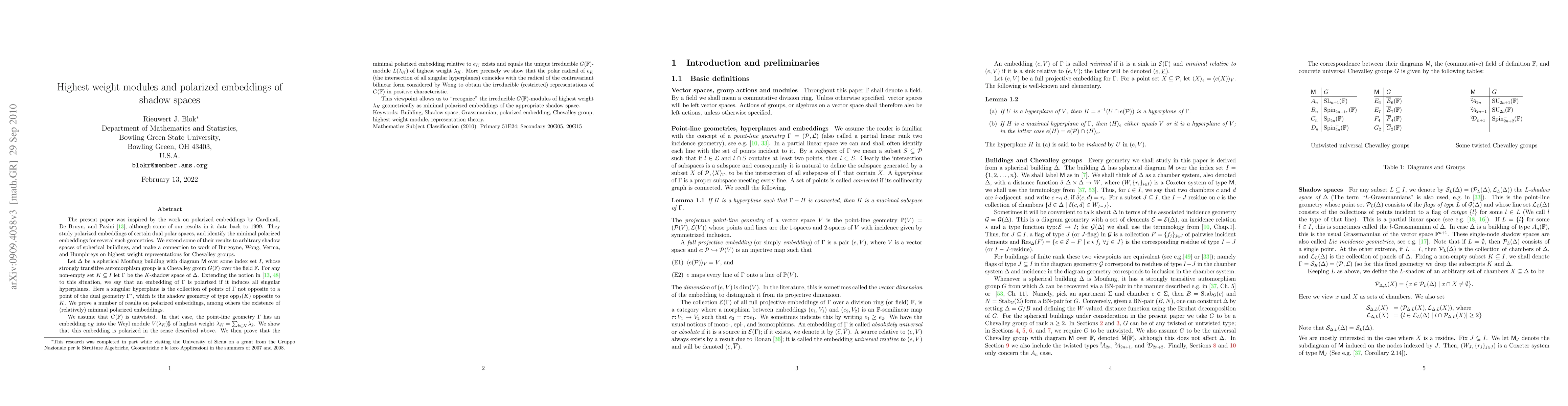 Let Gamma be the K-shadow space of a spherical building Delta. An embedding V of Gamma is called polarized if it affords all "singular" hyperplanes of Gamma. Suppose that Delta is associated to a Chevalley group G. Then Gamma can be embedded into what we call the Weyl module for G of highest weight lambda_K. It is proved that this module is polarized and that the associated minimal polarized embedding is precisely the irreducible G-module of highest weight lambda_K. In addition a number of general results on polarized embeddings of shadow spaces are proved. The last few sections are devoted to the study of specific shadow spaces, notably minuscule weight geometries, polar grassmannians, and projective flag-grassmannians. The paper is in part expository in nature so as to make this material accessible to a wide audience.
