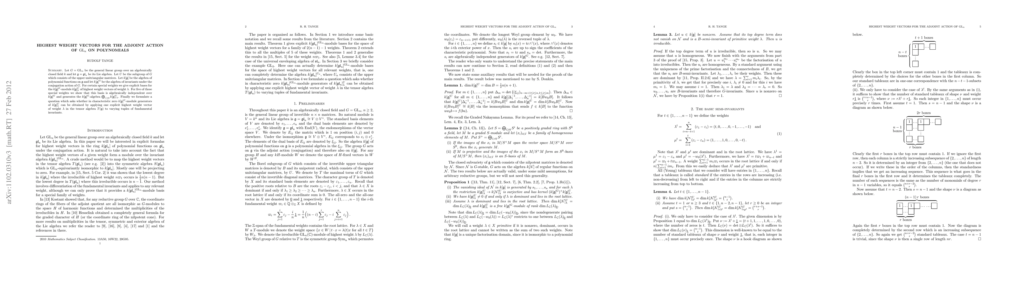 Let G=GL_n be the general linear group over an algebraically closed field k and let g=gl_n be its Lie algebra. Let U be the subgroup of G which consists of the upper unitriangular matrices. Let k[g] be the algebra of regular functions on $\g$. For 2(n-1)-1 weights we give explicit bases for the k[g]^G-module k[g]^U_\lambda of highest weight vectors of weight \lambda. For 5 of those weights we show that this basis is algebraically independent over the invariants k[g]^G and generates the k[g]^G-algebra $\bigoplus_{r\ge0}k[\g]^U_{r\lambda}$. Finally we formulate a question which asks whether in characteristic zero k[g]^G-module generators of k[g]^U_\lambda can be obtained by applying one explicit highest weight vector of weight \lambda in the tensor algebra T(g) to varying tuples of fundamental invariants.