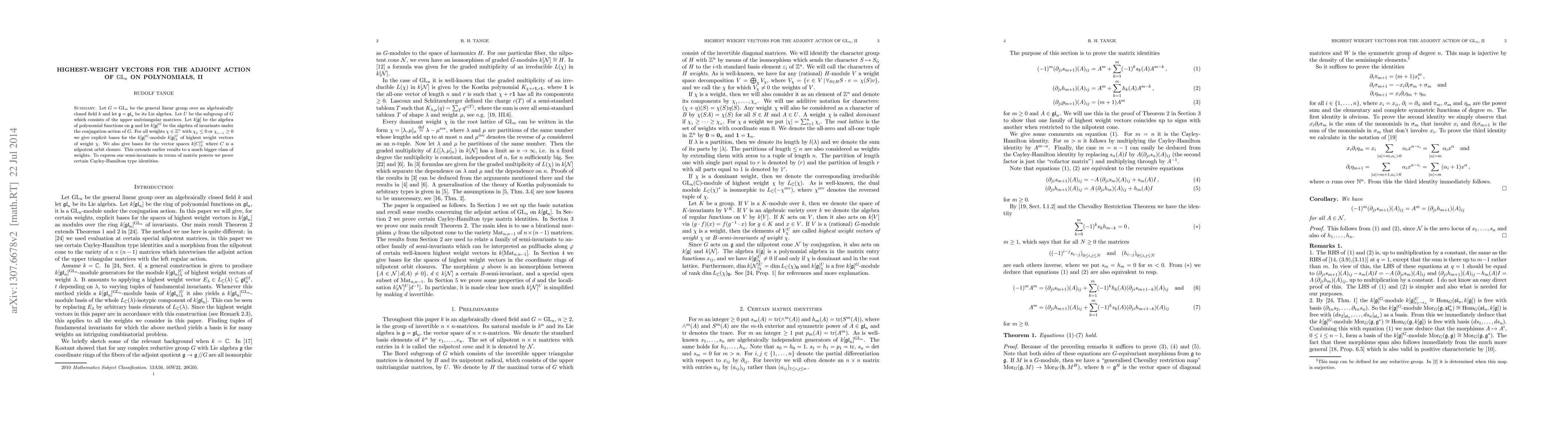 Let G=GL_n be the general linear group over an algebraically closed field k and let g=gl_n be its Lie algebra. Let U be the subgroup of G which consists of the upper unitriangular matrices. Let k[g] be the algebra of polynomial functions on g and let k[g]^G be the algebra of invariants under the conjugation action of G. For all weights chi in Z^n with chi_2<=0 or chi_{n-1}>=0 we give explicit bases for the k[g]^G-module k[g]^U_chi of highest weight vectors of weight chi. This extends earlier results to a much bigger class of weights. To express our semi-invariants in terms of matrix powers we prove certain Cayley-Hamilton type identities.