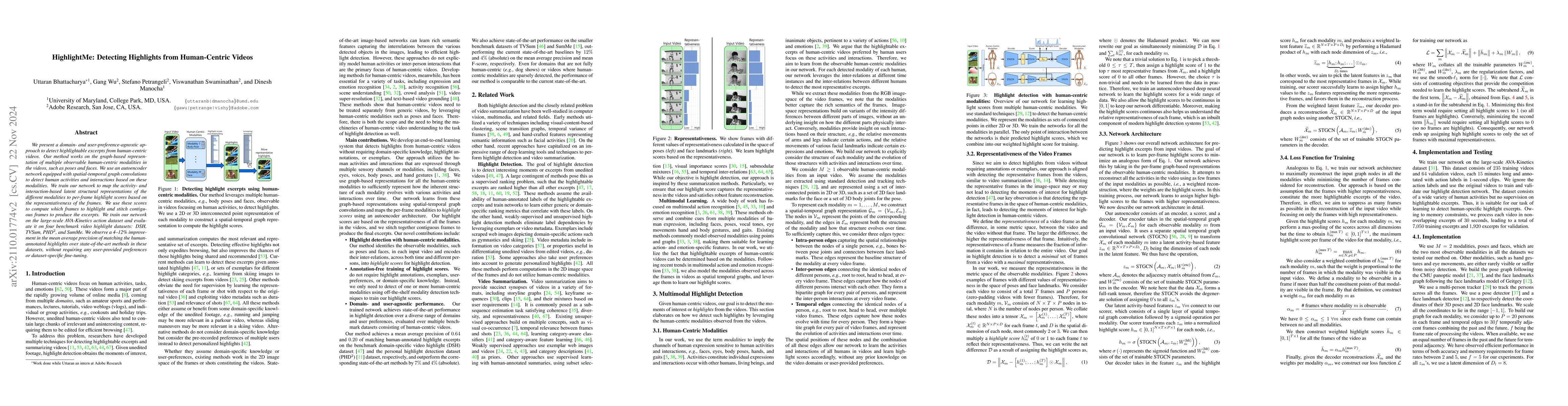 A new method detects highlights in human-centric videos by analyzing various modalities like poses and faces, improving precision by 4-12% over state-of-the-art methods without requiring user preferences or fine-tuning.