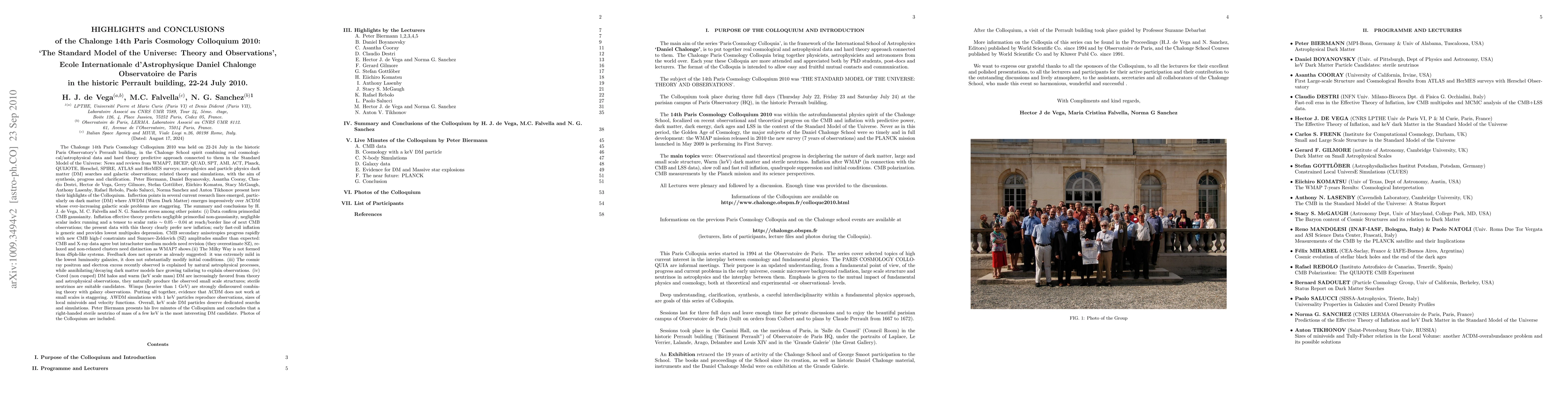 The Chalonge 14th Paris Cosmology Colloquium was held on 22-24 July 2010 in Paris Observatory on the Standard Model of the Universe: News from WMAP7, BICEP, QUAD, SPT, AMI, ACT, Planck, QUIJOTE and Herschel; dark matter (DM) searches and galactic observations; related theory and simulations. %aiming synthesis, progress and clarification. P Biermann, D Boyanovsky, A Cooray, C Destri, H de Vega, G Gilmore, S Gottlober, E Komatsu, S McGaugh, A Lasenby, R Rebolo, P Salucci, N Sanchez and A Tikhonov present here their highlights of the Colloquium. Inflection points emerged: LambdaWDM (Warm DM) emerges impressively over LambdaCDM whose galactic scale problems are ever-increasing. Summary and conclusions by H. J. de Vega, M. C. Falvella and N. G. Sanchez stress among other points: (i) Primordial CMB gaussianity is confirmed. Inflation effective theory predicts a tensor to scalar ratio 0.05-0.04 at reach/border line of next CMB observations, early fast-roll inflation provides lowest multipoles depression. SZ amplitudes are smaller than expected: CMB and X-ray data agree but intracluster models need revision and relaxed/non-relaxed clusters distinction. (ii) cosmic ray positron excess is explained naturally by astrophysical processes, annihilating/decaying dark matter needs growing tailoring. (iii) Cored (non cusped) DM halos and warm (keV scale mass) DM are increasingly favored from theory and observations, naturally producing observed small scale structures, wimps turn strongly disfavoured. LambdaWDM 1 keV simulations well reproduce observations. Evidence that LambdaCDM does not work at small scales is staggering. P Biermann presents his live minutes of the Colloquium and concludes that a keV sterile neutrino is the most interesting DM candidate. Photos of the Colloquium are included.