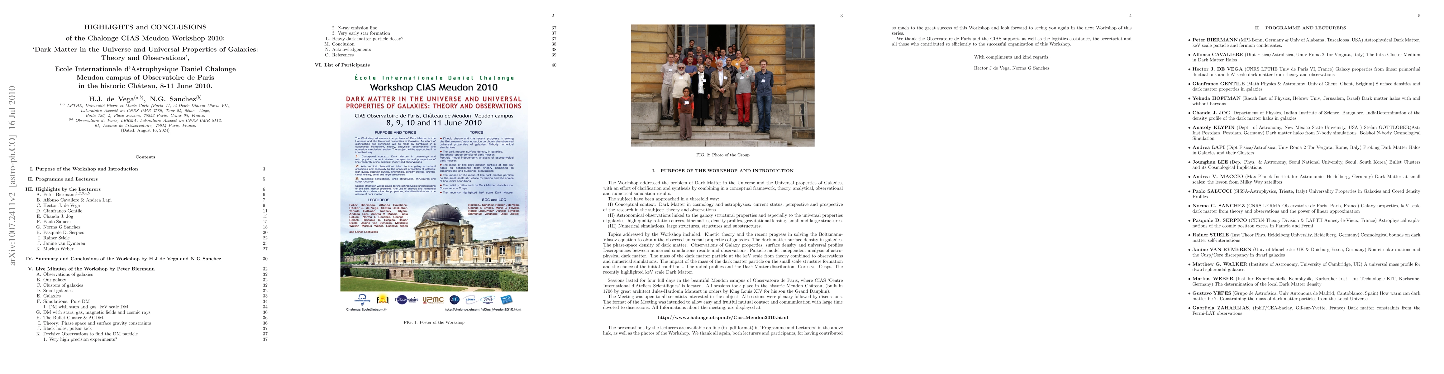 The CIAS Chalonge Workshop `Dark Matter in the Universe and Universal Properties of Galaxies: Theory and Observations', was held at the Meudon Ch^ateau of Observatoire de Paris on 8-11 June 2010. The Workshop approached DM in a fourfold way: astronomical observations of DM structures (galaxy properties, halos, rotation curves and density profiles), DM numerical simulations (with and without baryons), theoretical astrophysics and cosmology (kinetic theory, Boltzmann-Vlasov evolution), astroparticle physics. Peter Biermann, Alfonso Cavaliere, Hector J. de Vega, Gianfranco Gentile, Chandra Jog, Andrea Lapi, Paolo Salucci, Norma G. Sanchez, Pasquale Serpico, Rainer Stiele, Janine van Eymeren and Markus Weber present here their highlights of the Workshop. The summary and conclusions by H. J. de Vega and N. G. Sanchez stress among other points the growing evidence that DM particles have a mass in the keV scale and that those keV scale particles naturally produce the small scale structures observed in galaxies. Wimps (DM particles heavier than 1 GeV) are strongly disfavoured combining theory with galaxy astronomical observations. Peter Biermann presents his live minutes of the Workshop and concludes that a right-handed sterile neutrino of mass of a few keV is the most interesting DM candidate. Photos of the Workshop are included.