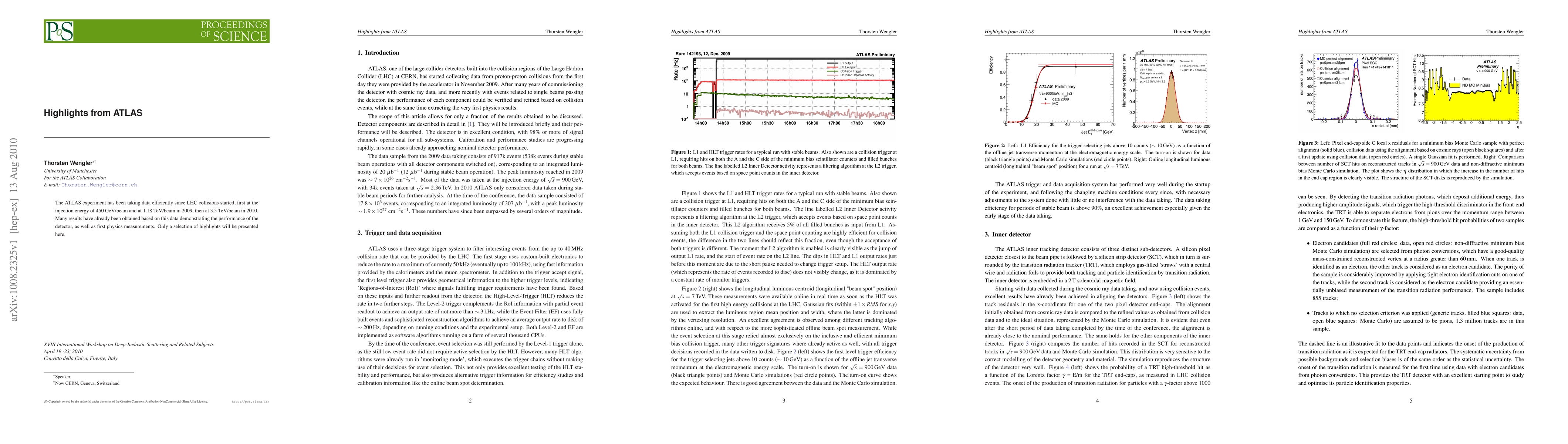 The ATLAS experiment has been taking data efficiently since LHC collisions started, first at the injection energy of 450 GeV/beam and at 1.18 TeV/beam in 2009, then at 3.5 TeV/beam in 2010. Many results have already been obtained based on this data demonstrating the performance of the detector, as well as first physics measurements. Only a selection of highlights will be presented here.