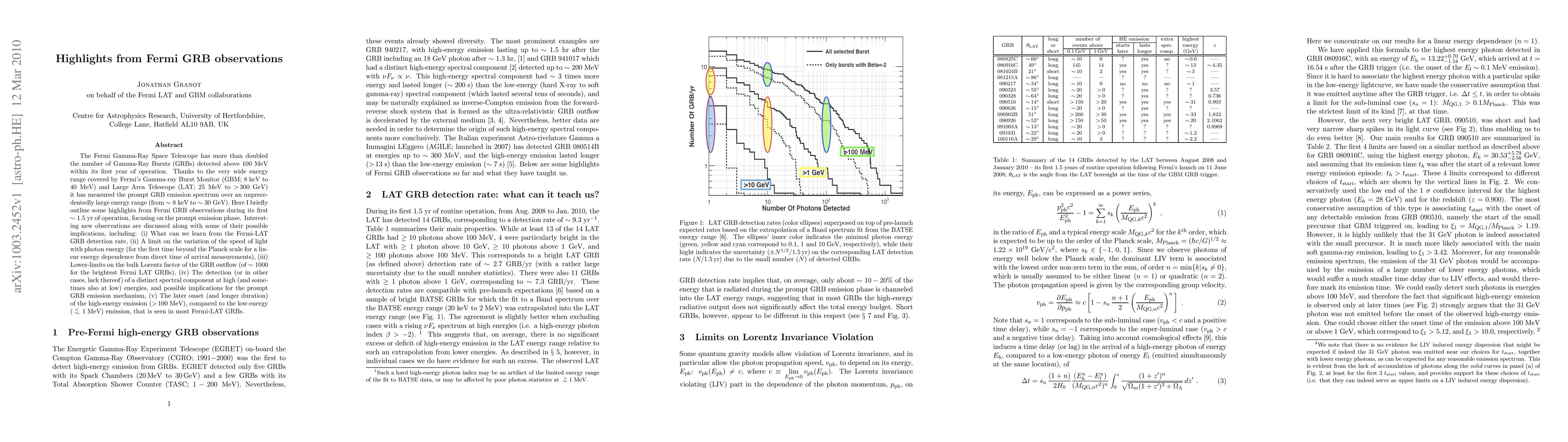 The Fermi Gamma-Ray Space Telescope has significantly increased the number of detected Gamma-Ray Bursts (GRBs) above 100 MeV, providing unprecedented spectral data from 8 keV to 30 GeV. Key findings include insights into the GRB detection rate, constraints on the speed of light variation, and implications for the GRB emission mechanism.