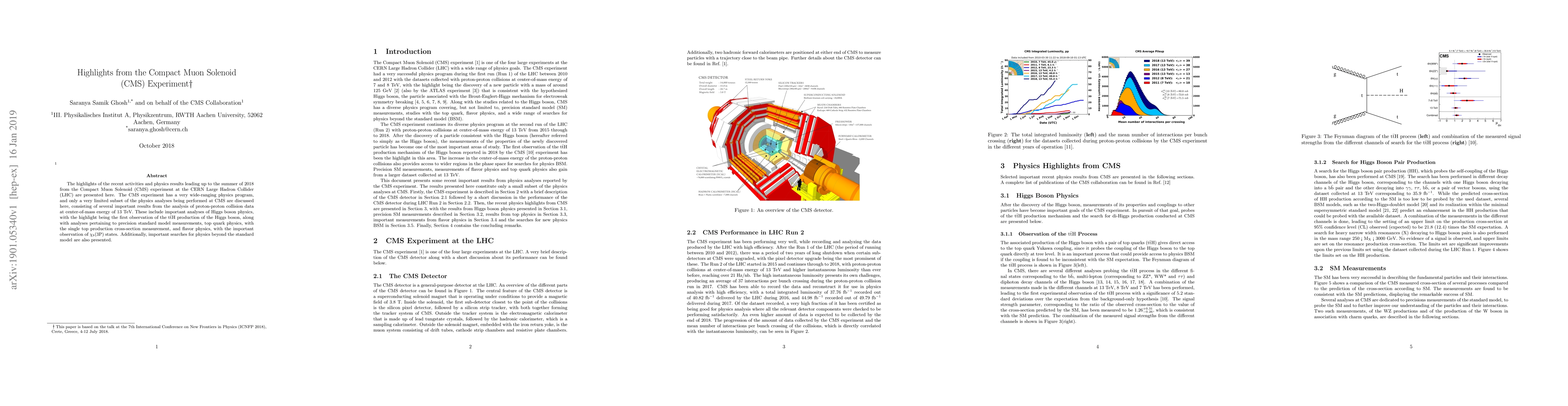 The highlights of the recent activities and physics results leading up to the summer of 2018 from the Compact Muon Solenoid (CMS) experiment at the CERN Large Hadron Collider (LHC) are presented here. The CMS experiment has a very wide-ranging physics program, and only a very limited subset of the physics analyses being performed at CMS are discussed here, consisting of several important results from the analysis of proton-proton collision data at center-of-mass energy of 13 TeV. These include important analyses of Higgs boson physics, with the highlight being the first observation of the $\mathrm{t\bar{t}H}$ production of the Higgs boson, along with analyses pertaining to precision standard model measurements, top quark physics, with the single top production cross-section measurement, and flavor physics, with the important observation of $\chi_{b}$(3P) states. Additionally, important searches for physics beyond the standard model are also presented.