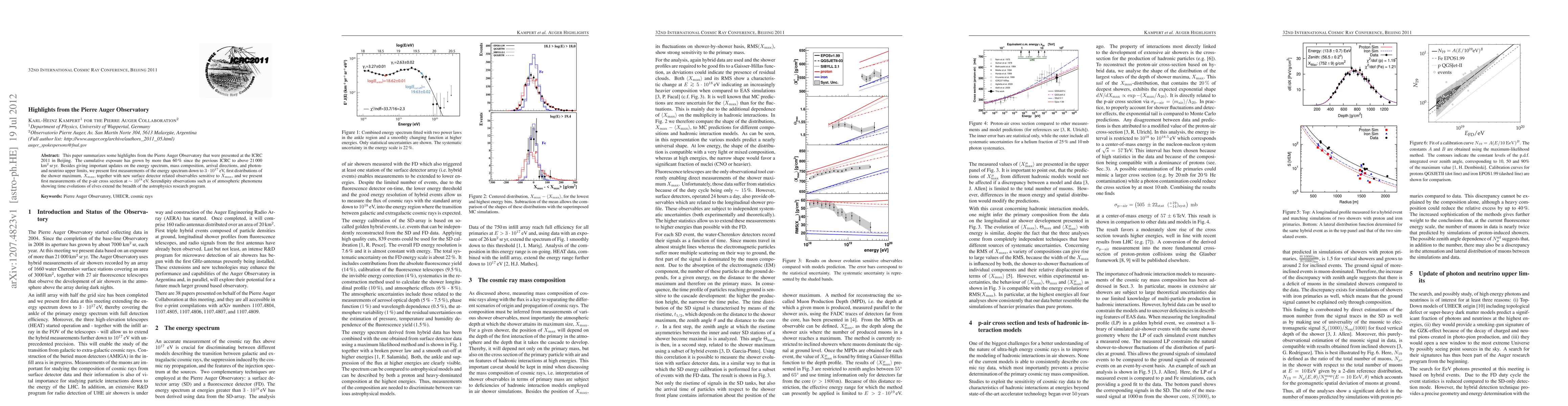 This paper summarizes some highlights from the Pierre Auger Observatory that were presented at the ICRC 2011 in Beijing. The cumulative exposure has grown by more than 60% since the previous ICRC to above 21000 km^2 sr yr. Besides giving important updates on the energy spectrum, mass composition, arrival directions, and photon- and neutrino upper limits, we present first measurements of the energy spectrum down to 3 x 10^{17} eV, first distributions of the shower maximum, X_max, together with new surface detector related observables sensitive to X_max, and we present first measurements of the p-air cross section at ~ 10^{18} eV. Serendipity observations such as of atmospheric phenomena showing time evolutions of elves extend the breadth of the astrophysics research program.