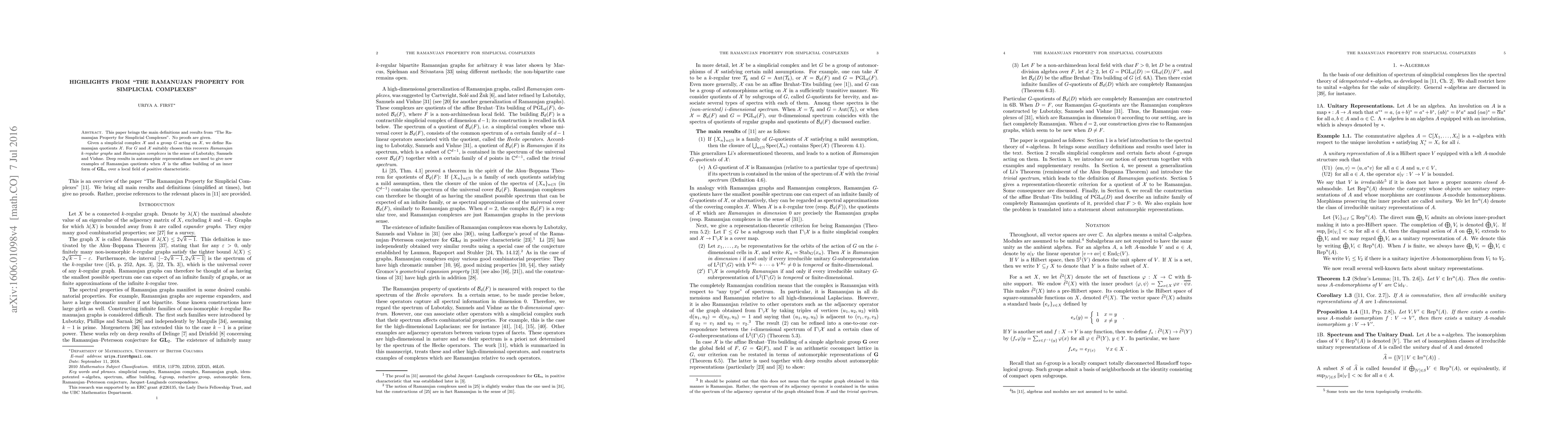 This paper brings the main definitions and results from "The Ramanujan Property for Simplicial Complexes" [arXiv:1605.02664]. No proofs are given. Given a simplicial complex $\mathcal{X}$ and a group $G$ acting on $\mathcal{X}$, we define Ramanujan quotients of $\mathcal{X}$. For $G$ and $\mathcal{X}$ suitably chosen this recovers Ramanujan $k$-regular graphs and Ramanujan complexes in the sense of Lubotzky, Samuels and Vishne. Deep results in automorphic representations are used to give new examples of Ramanujan quotients when $\mathcal{X}$ is the affine building of an inner form of $\mathbf{GL}_n$ over a local field of positive characteristic.