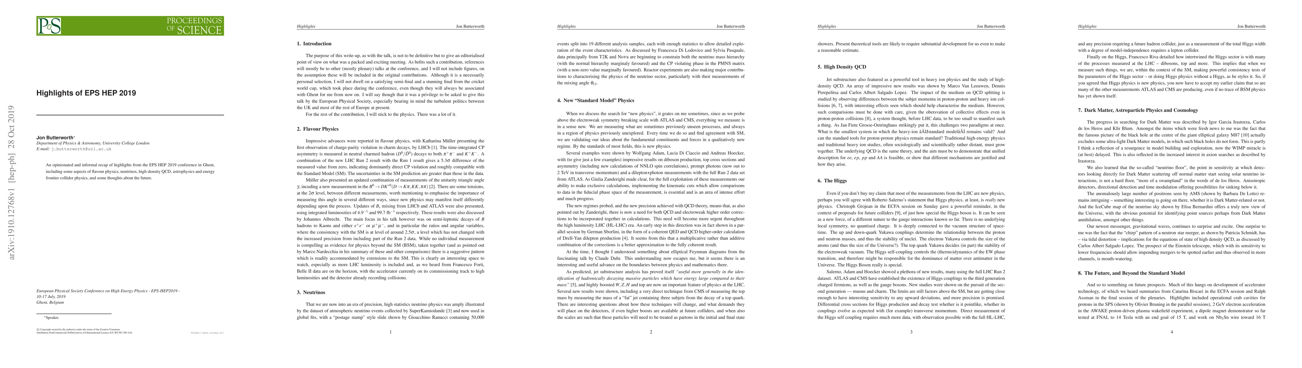 An opinionated and informal recap of highlights from the EPS HEP 2019 conference in Ghent, including some aspects of flavour physics, neutrinos, high-density QCD, astrophysics and energy frontier collider physics, and some thoughts about the future.
