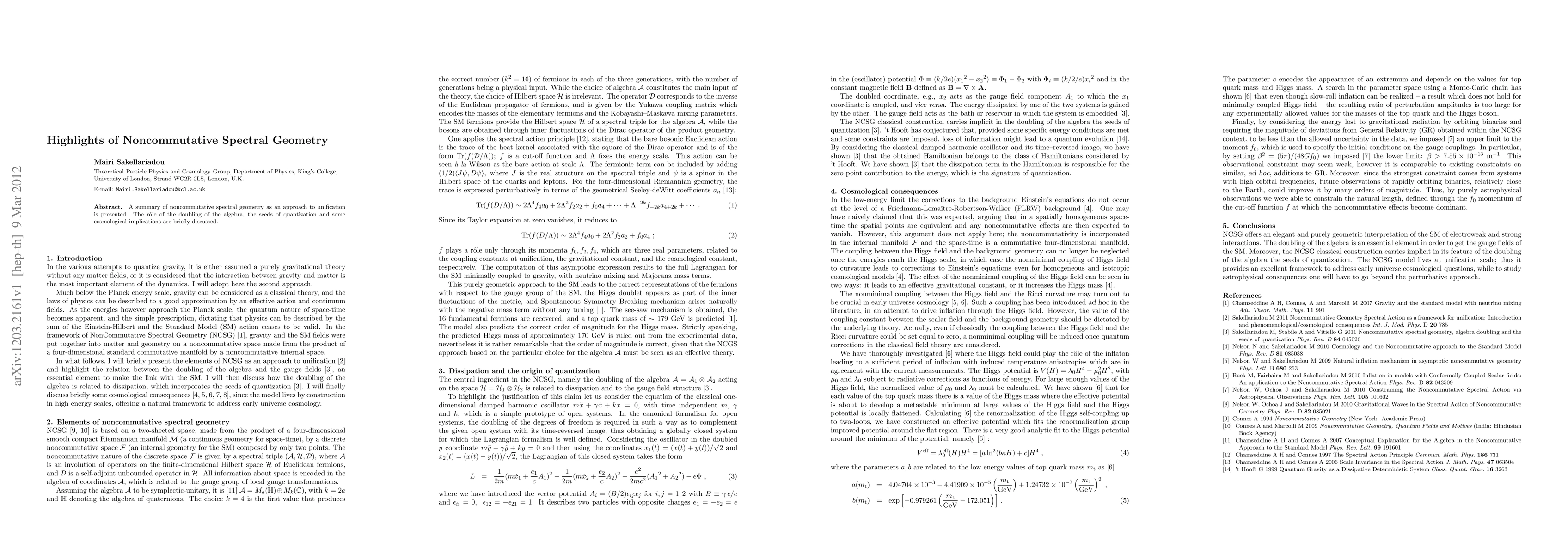 A summary of noncommutative spectral geometry as an approach to unification is presented. The role of the doubling of the algebra, the seeds of quantization and some cosmological implications are briefly discussed.