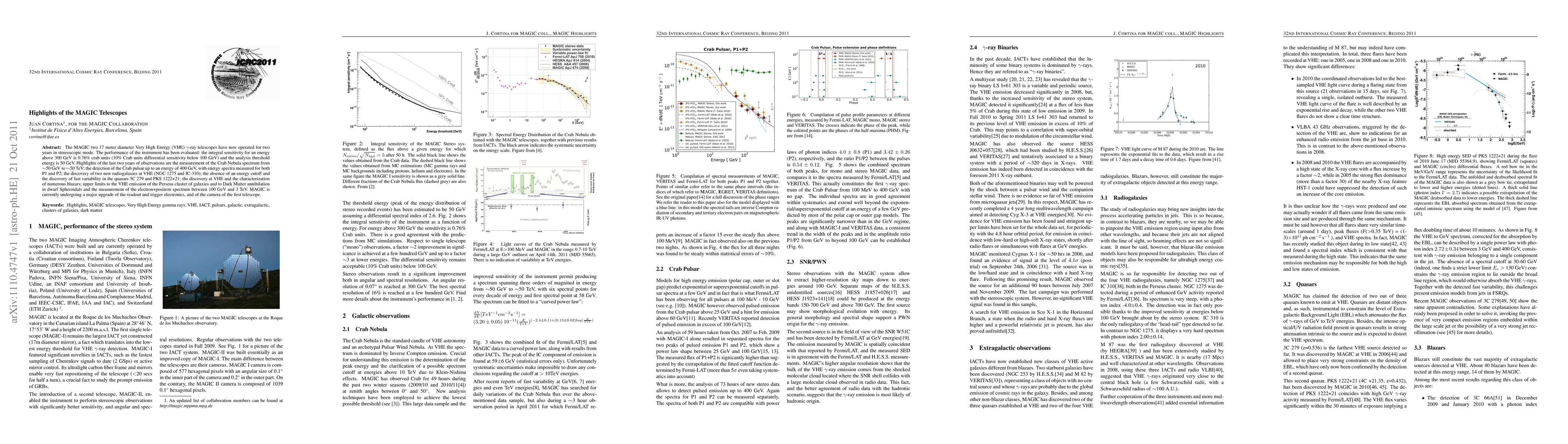 The MAGIC two 17 meter diameter Very High Energy (VHE) gamma-ray telescopes have now operated for two years in stereoscopic mode. The performance of the instrument has been evaluated: the integral sensitivity for an energy above 300 GeV is 0.76% crab units (10% Crab units differential sensitivity below 100 GeV) and the analysis threshold energy is 50 GeV. Highlights of the last two years of observations are the measurement of the Crab Nebula spectrum from ~50 GeV to ~50 TeV; the detection of the Crab pulsar up to an energy of 400 GeV, with energy spectra measured for both P1 and P2; the discovery of two new radiogalaxies at VHE (NGC 1275 and IC-310); the absence of an energy cutoff and the discovery of fast variability in the quasars 3C 279 and PKS 1222+21; the discovery at VHE and the characterization of numerous blazars; upper limits to the VHE emission of the Perseus cluster of galaxies and to Dark Matter annihilation in dwarf Spheroidals and the measurement of the electron+positron spectrum between 100 GeV and 3 TeV. MAGIC is currently undergoing a major upgrade of the readout and trigger electronics, and of the camera of the first telescope.