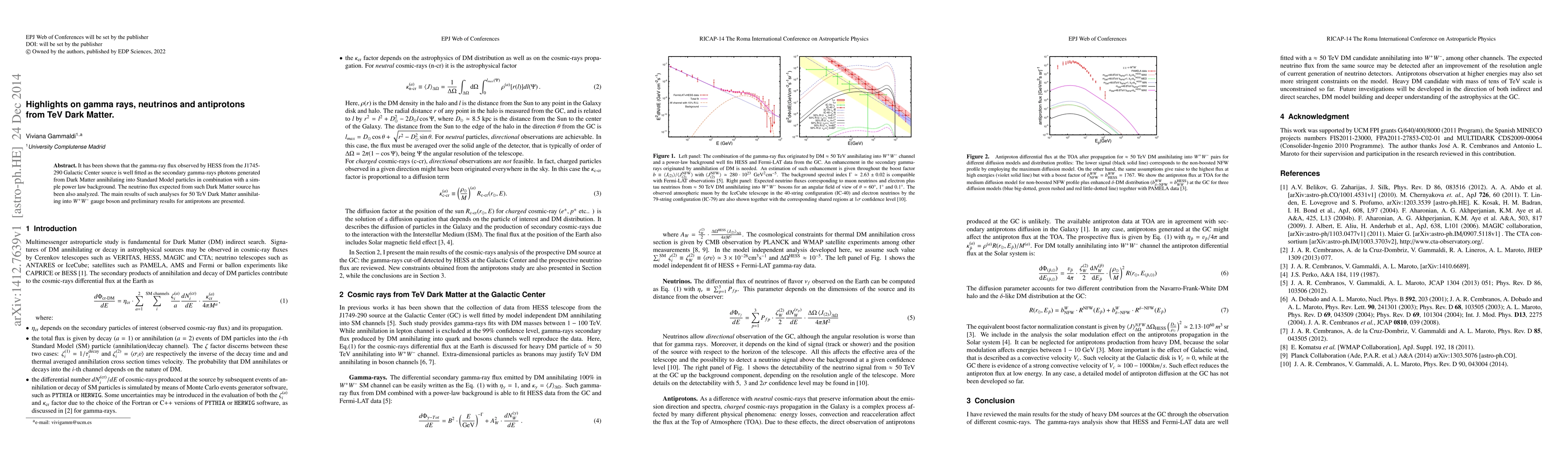 This paper analyzes gamma-ray, neutrino, and antiproton fluxes from TeV Dark Matter annihilating into W+W- gauge bosons, showing that HESS observations of the J1745-290 Galactic Center source align with secondary gamma-rays from Dark Matter annihilation, and presents preliminary results for antiprotons.