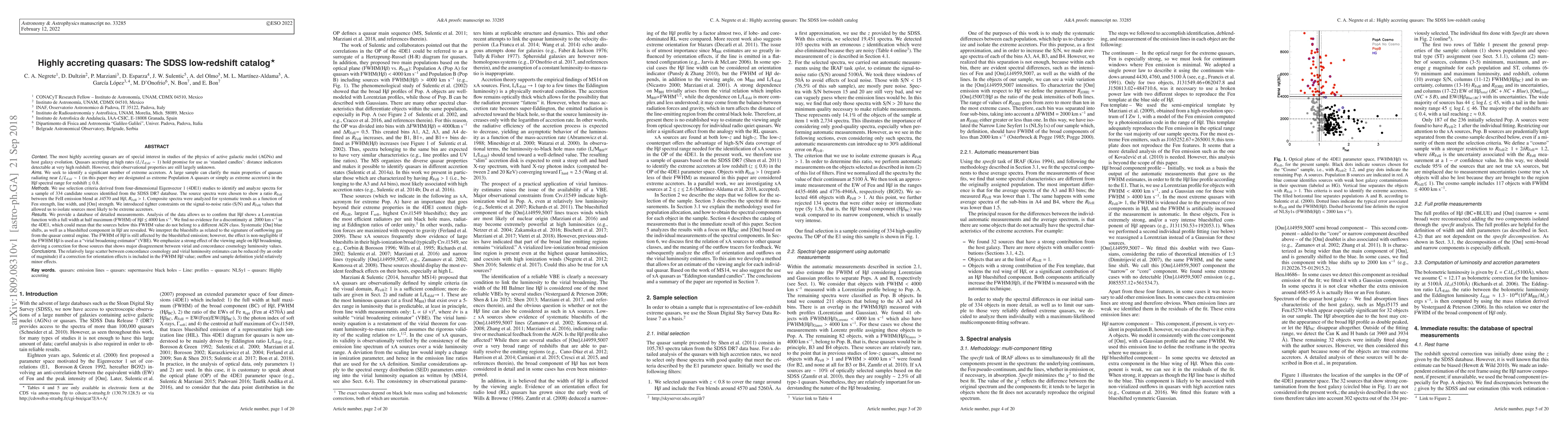 The most highly accreting quasars (xA) are of special interest in studies of the physics of AGNs and host galaxy evolution. Quasars accreting at high rates (L/LEdd $\sim$ 1) hold promise for use as 'standard candles': distance indicators detectable at very high redshift. However, their observational properties are largely unknown. A large sample of xA can clarify the main properties of quasars radiating near L/LEdd $\sim$ 1 in the Hb spectral range for redshift $\lt$ 0.8. We use selection criteria derived from 4DE1 studies to identify and analyze spectra for a sample of 334 candidate sources identified from the SDSS DR7 database. The source spectra were chosen to show a ratio RFeII between the FeII emission blend at 4570 \AA\ and Hb, RFeII $\gt$ 1. Composite spectra were analyzed for systematic trends as a function of FeII strength, line width, and [OIII] strength. We introduced tighter constraints on the signal-to-noise ratio (S/N) and RFeII values that allowed us to isolate sources most likely to be extreme accretors. We provide a database of detailed measurements. Analysis of the data allows us to confirm that Hb shows a Lorentzian function with a FWHM of Hb $\lt$ 4000 km s-1. Systematic [OIII] blue shifts, as well as a blueshifted component in Hb are revealed. We interpret the blueshifts as related to the signature of outflowing gas from the quasar central engine. The FWHM of Hb is still affected by the blueshifted emission, however, the effect is non-negligible if the FWHM Hb is used as a 'virial broadening estimator'. A effect of the viewing angle on Hb broadening, deriving a correction for those sources that shows disagreement between virial and concordance cosmology luminosity values. The scatter between concordance cosmology and virial luminosity estimates can be reduced if a correction for orientation effects is included in the FWHM Hb value.