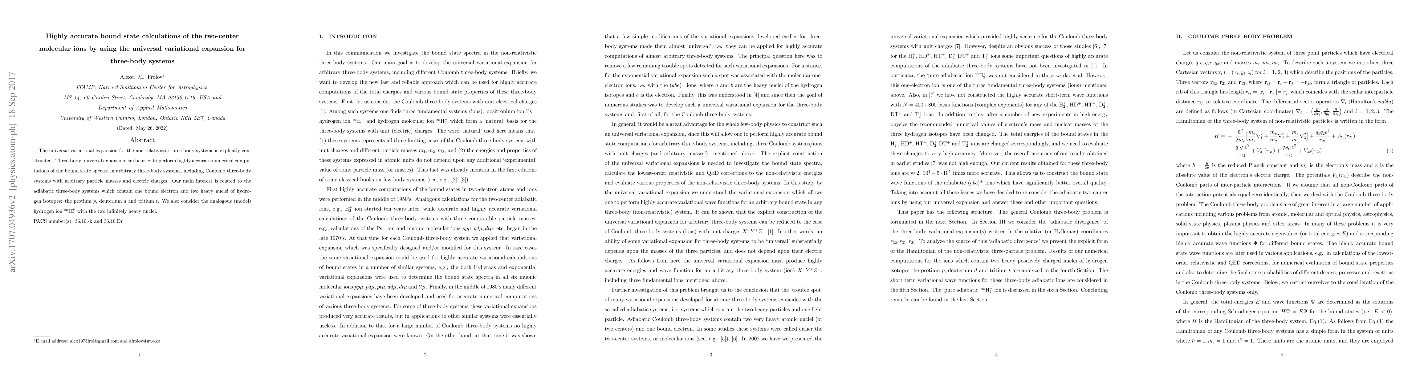 This paper constructs a universal variational expansion for non-relativistic three-body systems, enabling highly accurate calculations of bound state spectra, particularly for molecular ions like protium, deuterium, and tritium. It also applies this method to the model hydrogen ion with infinitely heavy nuclei.