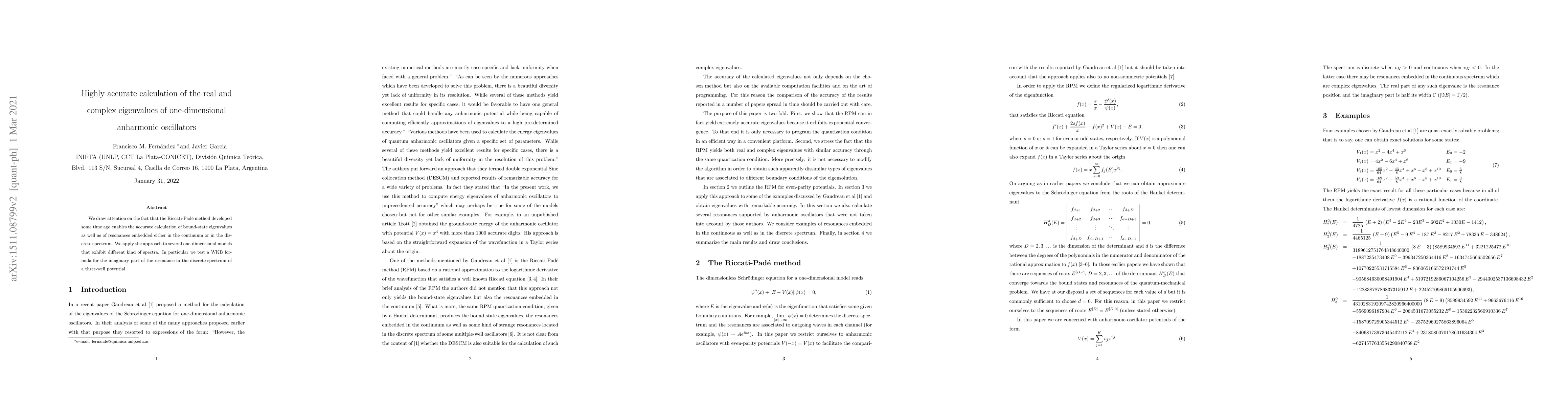 We draw attention on the fact that the Riccati-Pad\'e method developed some time ago enables the accurate calculation of bound-state eigenvalues as well as of resonances embedded either in the continuum or in the discrete spectrum. We apply the approach to several one-dimensional models that exhibit different kind of spectra. In particular we test a WKB formula for the imaginary part of the resonance in the discrete spectrum of a three-well potential.