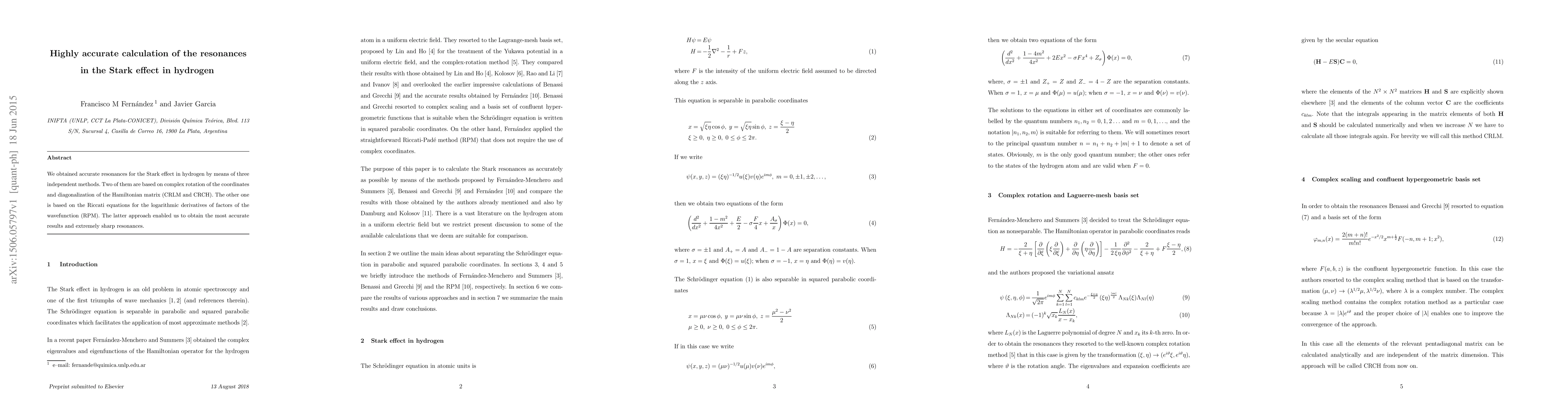 We obtained accurate resonances for the Stark effect in hydrogen by means of three independent methods. Two of them are based on complex rotation of the coordinates and diagonalization of the Hamiltonian matrix (CRLM and CRCH). The other one is based on the Riccati equations for the logarithmic derivatives of factors of the wavefunction (RPM). The latter approach enabled us to obtain the most accurate results and extremely sharp resonances.
