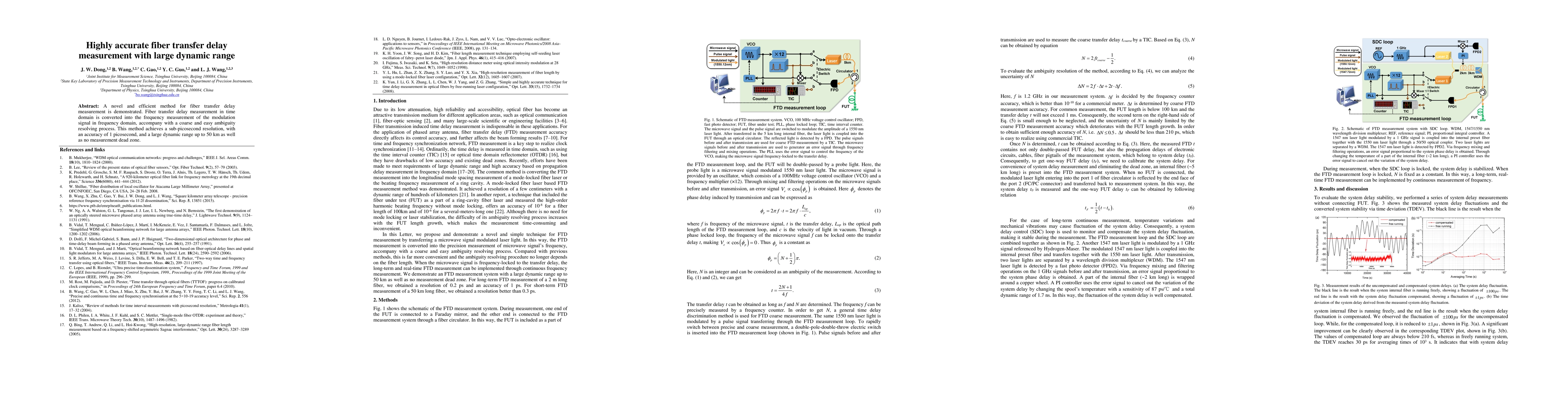 This paper presents a novel method for highly accurate fiber transfer delay measurement, converting time-domain delays into frequency-domain modulation signals for sub-picosecond resolution and an accuracy of 1 picosecond over a dynamic range of up to 50 km, with no dead zones.