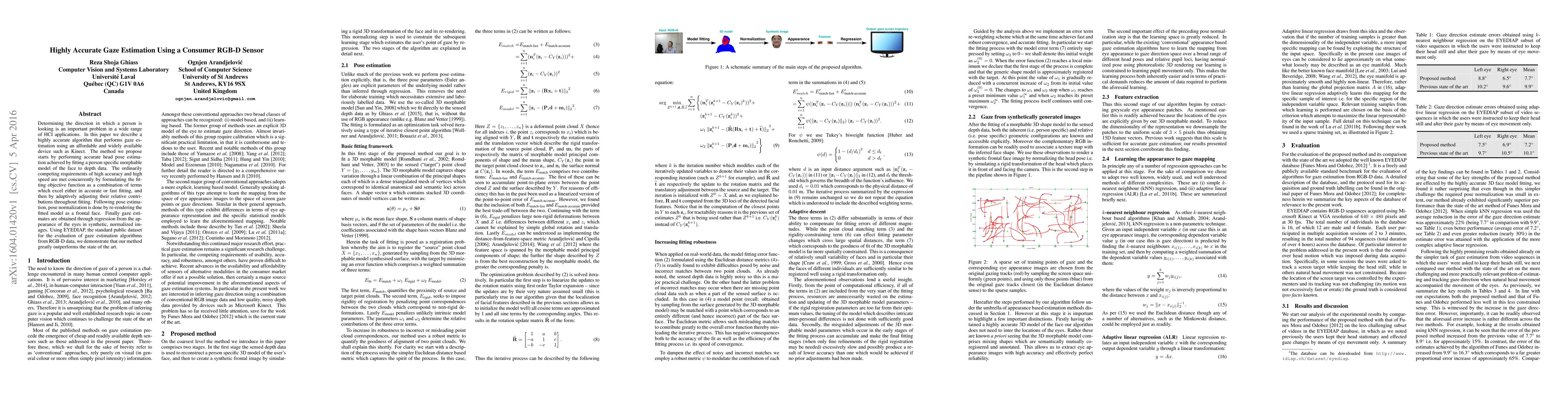 This paper presents a highly accurate gaze estimation algorithm using a low-cost Kinect sensor. It achieves this by fitting a personalized 3D face model to depth data for precise head pose estimation, then normalizing the pose and finally regressing gaze from eye appearance in synthetic frontal images. Results on the EYEDIAP dataset show significant improvement over existing methods.